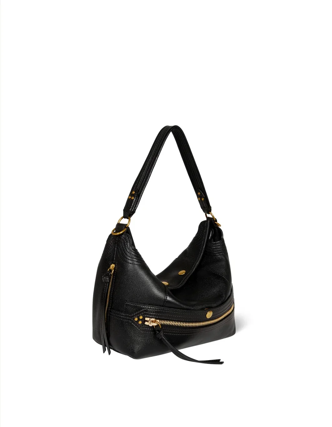 Sac baguette hobo porté épaule ou en croisé avec sa bandoulière. Bandoulière amovible, fermeture zippée avec des liens en cuirs et pressionnée. A l’extérieur : 3 poches zippées et 1 poche plaquée. A l’intérieur : 1 poche plaquée et 1 poche zippée. Anses de longueur 36cm, bandoulière amovible non réglable de 100cm. Compatible avec toutes […]