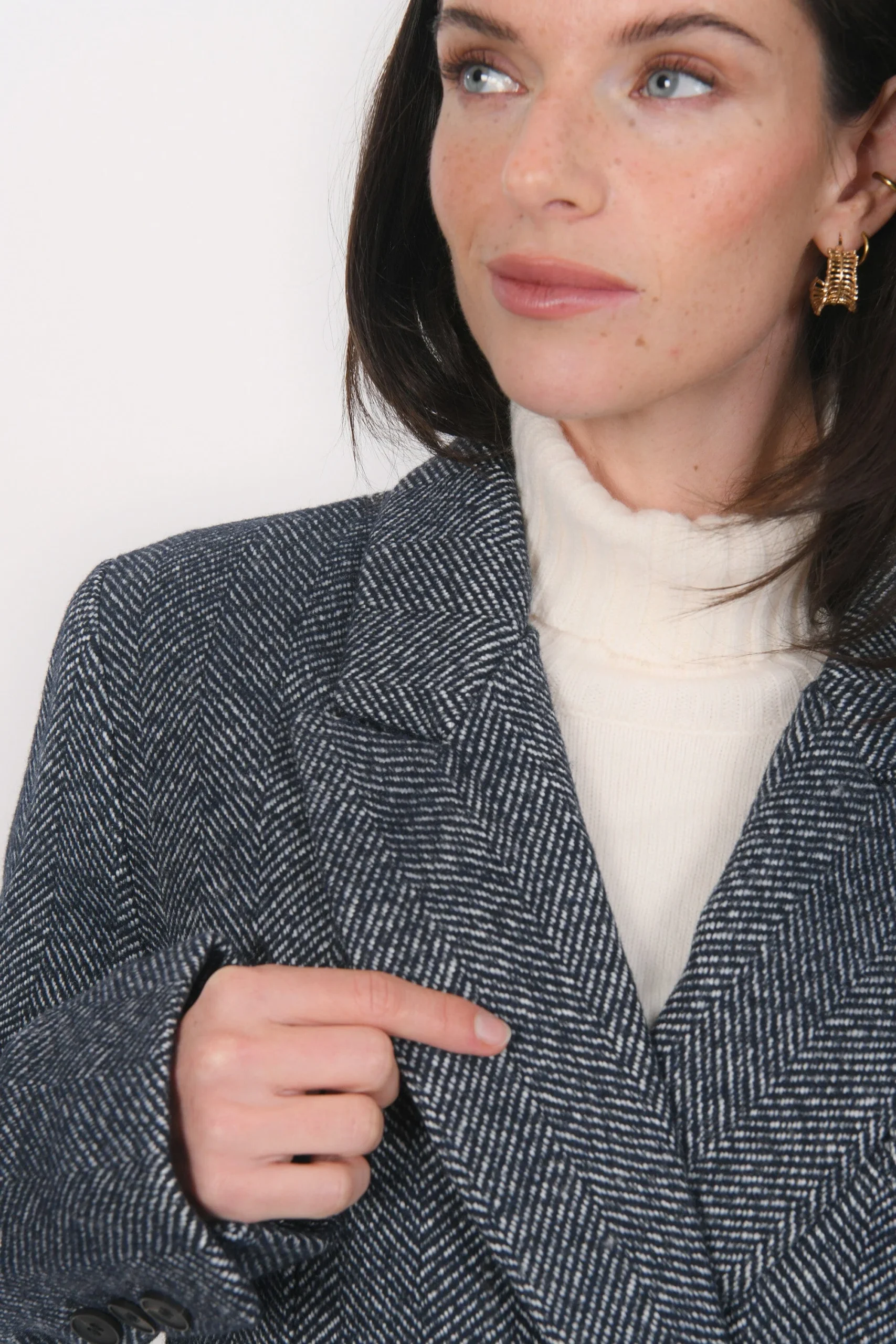 Bolton, le manteau long en tweed qui allonge la silhouetteLong manteau en maille chinée contenant de la laineGrand col, double boutonnageFausse poche poitrine passepoilée Deux poches passepoilées à rabatFines épaulettes, manches tailleur avec boutons sur fausses boutonnièreFente milieu dosCoupe droiteLongueur 119cm en T36