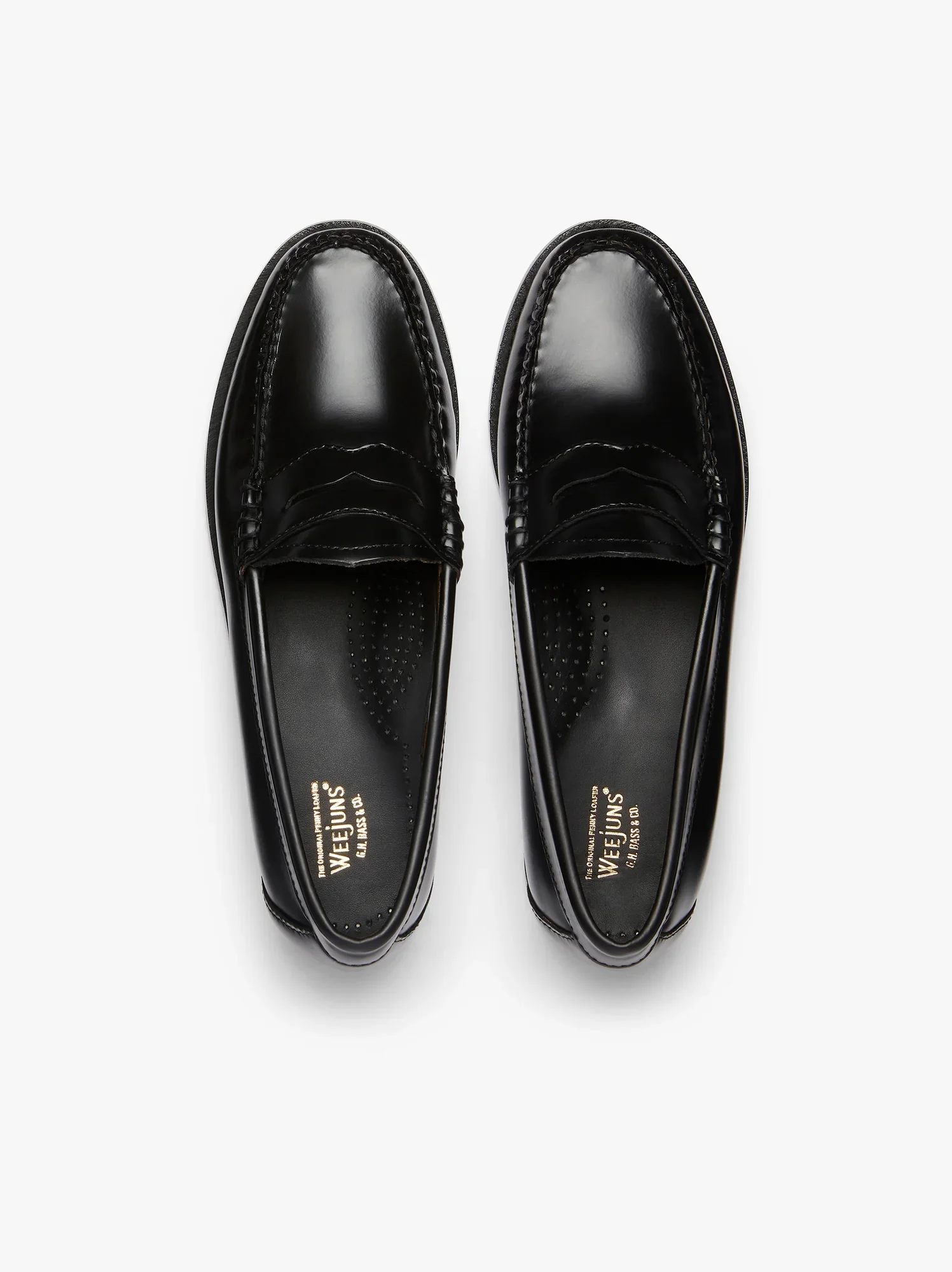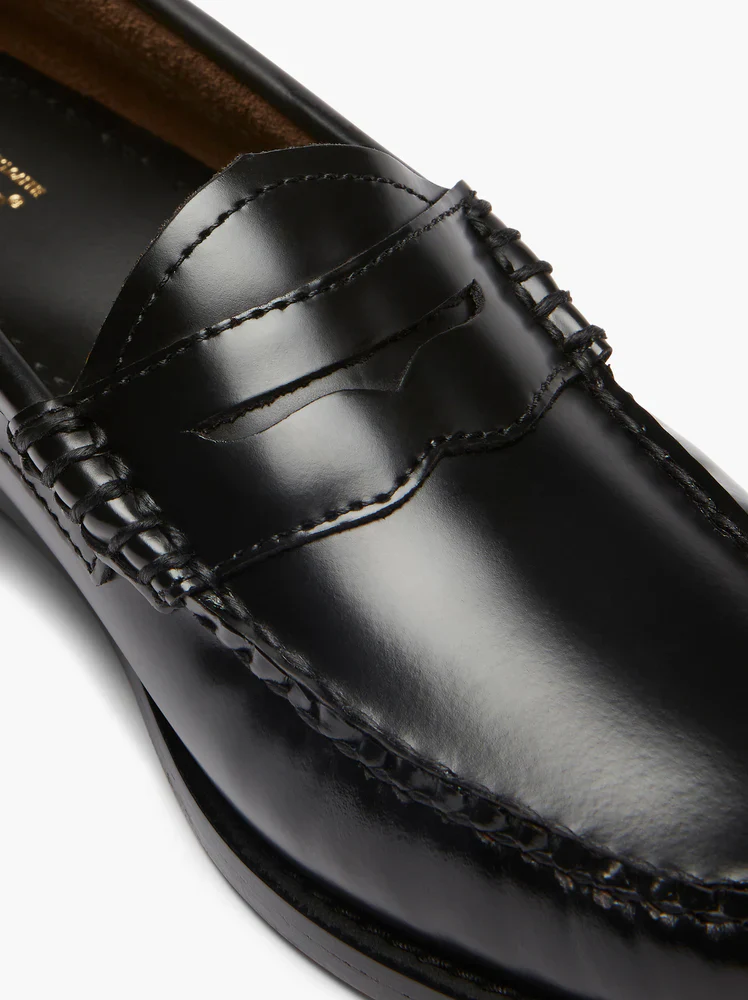 Mocassin Penny • Cuir noir avec semelle en cuir • conception a enfiler • Coutures cousues à la main en fil ciré ton sur ton • Sans doublure • Coutures polies noires sur la semelle • Semelle en cuir naturel poli avec pièce supérieure en caoutchouc noir