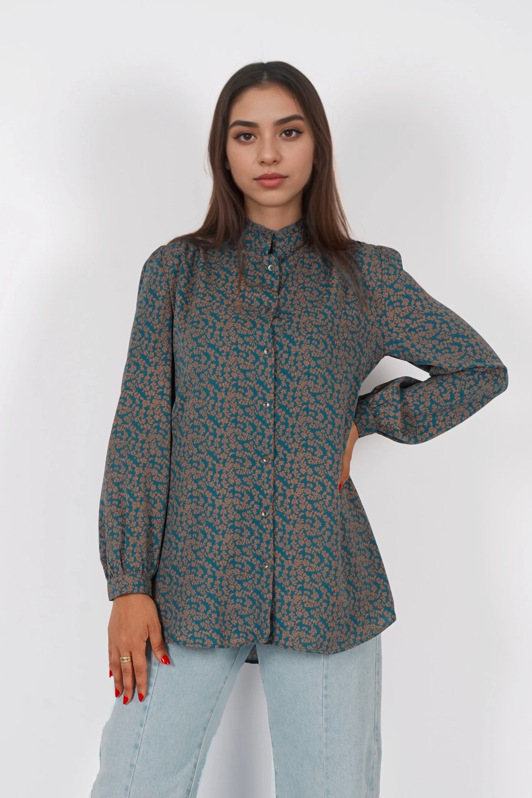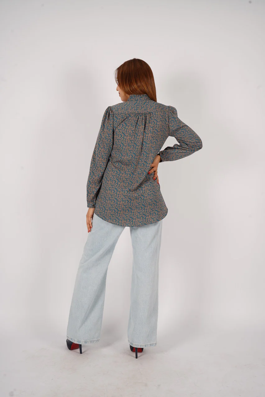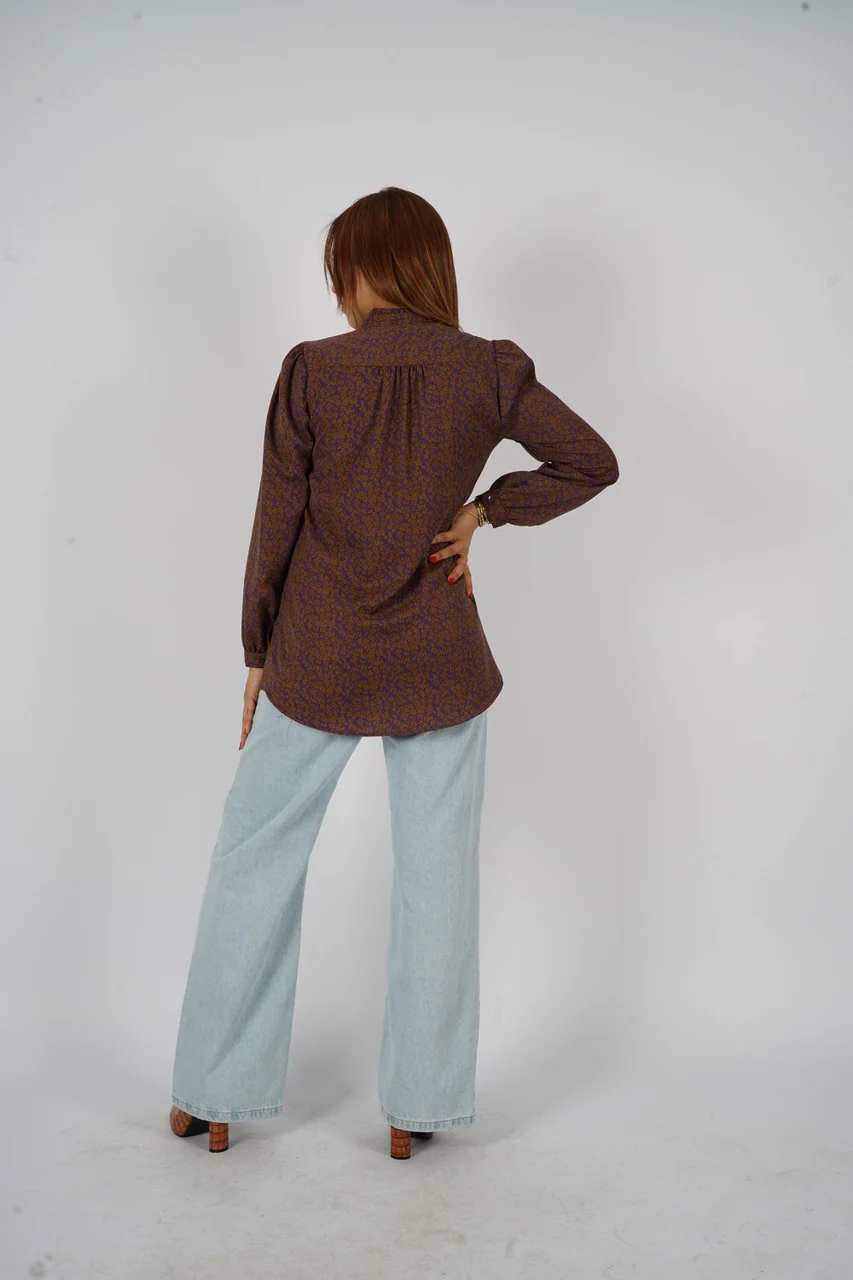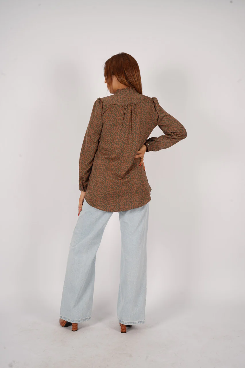 Chemise imprimée avec fermeture bouton boutonnière, col MAO avec volants, manches longues et un poignet chemisier, boutonné une fois, avec des plis sur les découpes épaule.