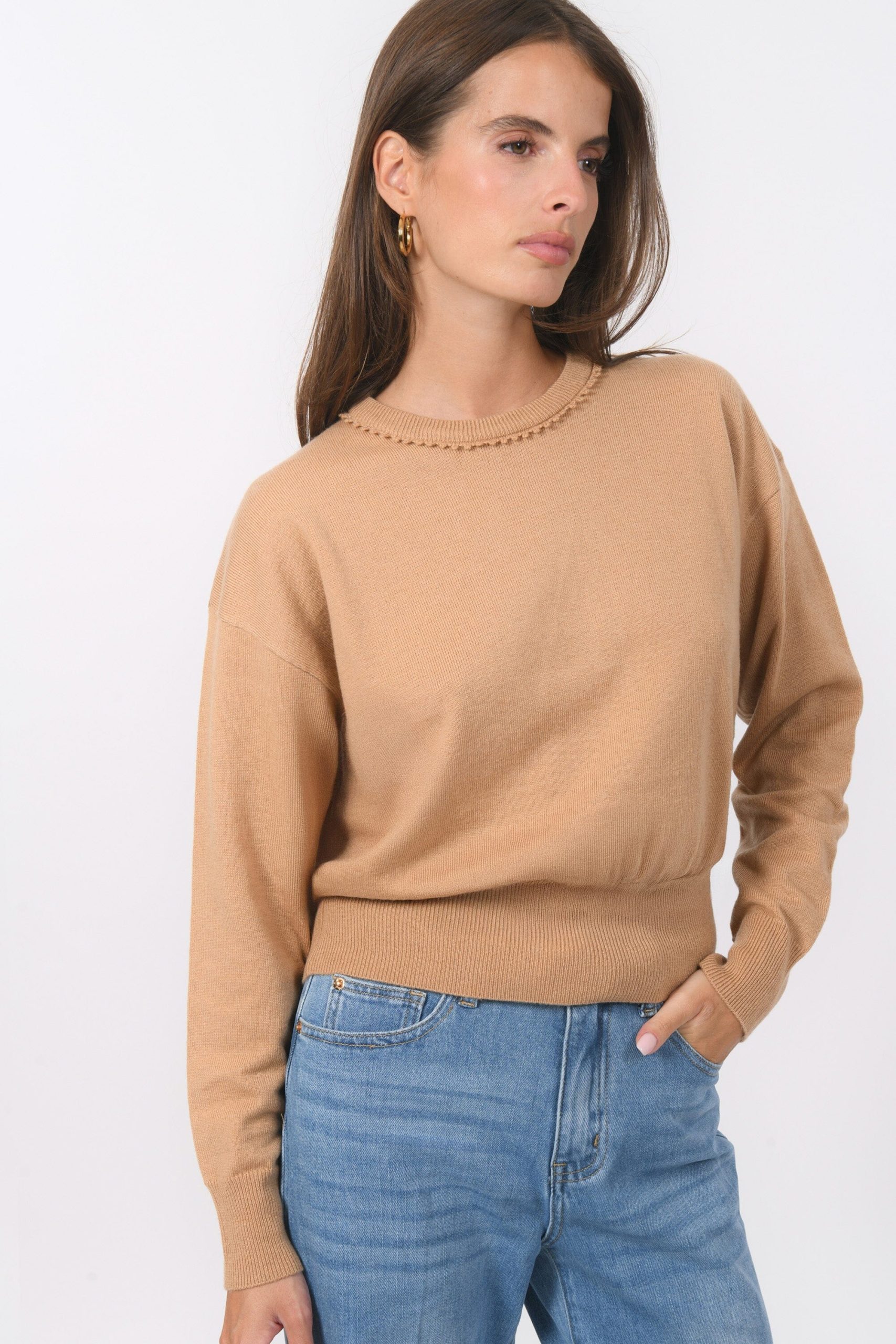 A décliner en version décontractée ou plus habillée, voici le pull BacotEn laine mélangée, maille fine et douceEncolure ronde bordée d’un galon fantaisie façon croquetEmmanchures descenduesLongueur 53cm en T0 Inès mesure 1m71 et porte une taille 0