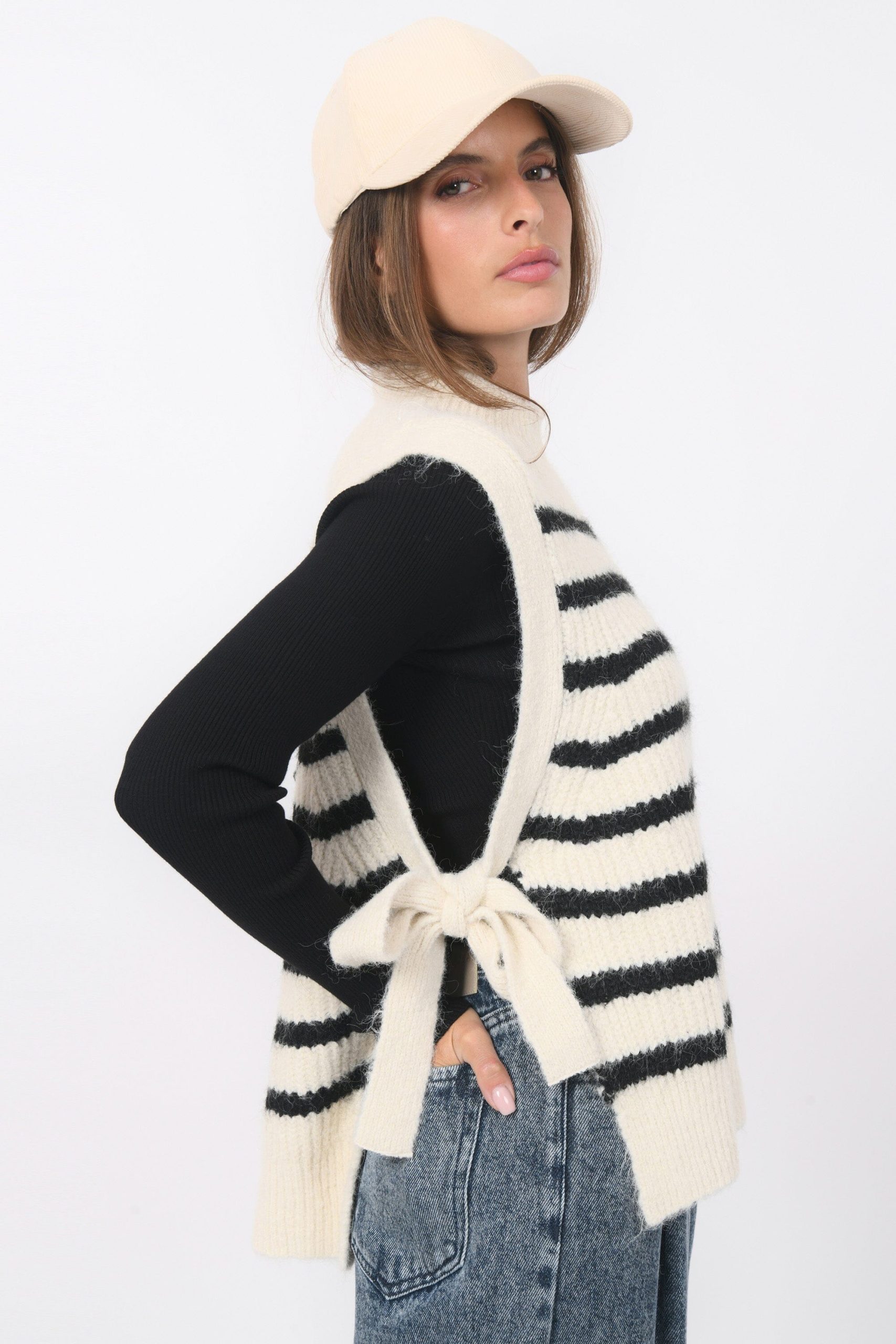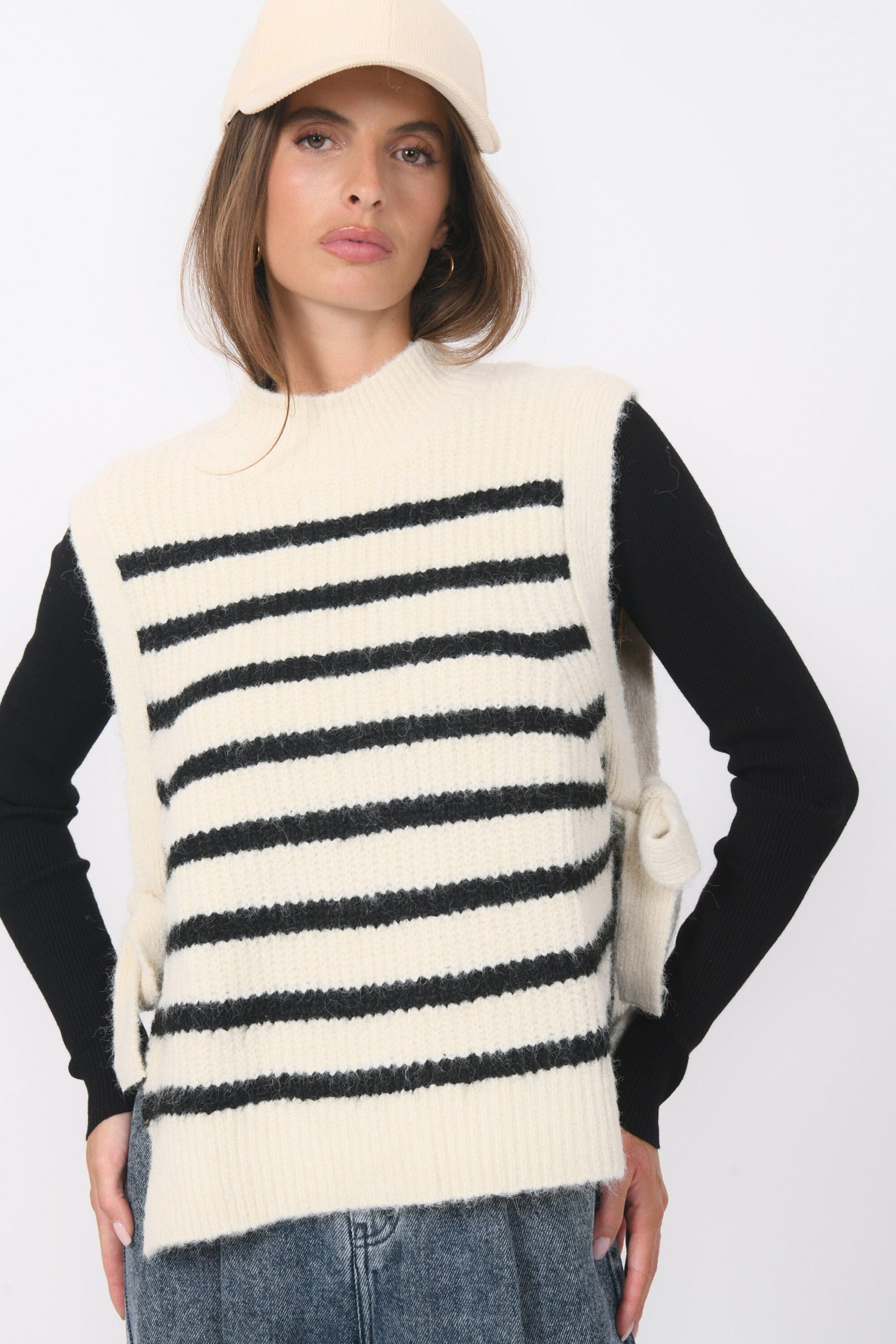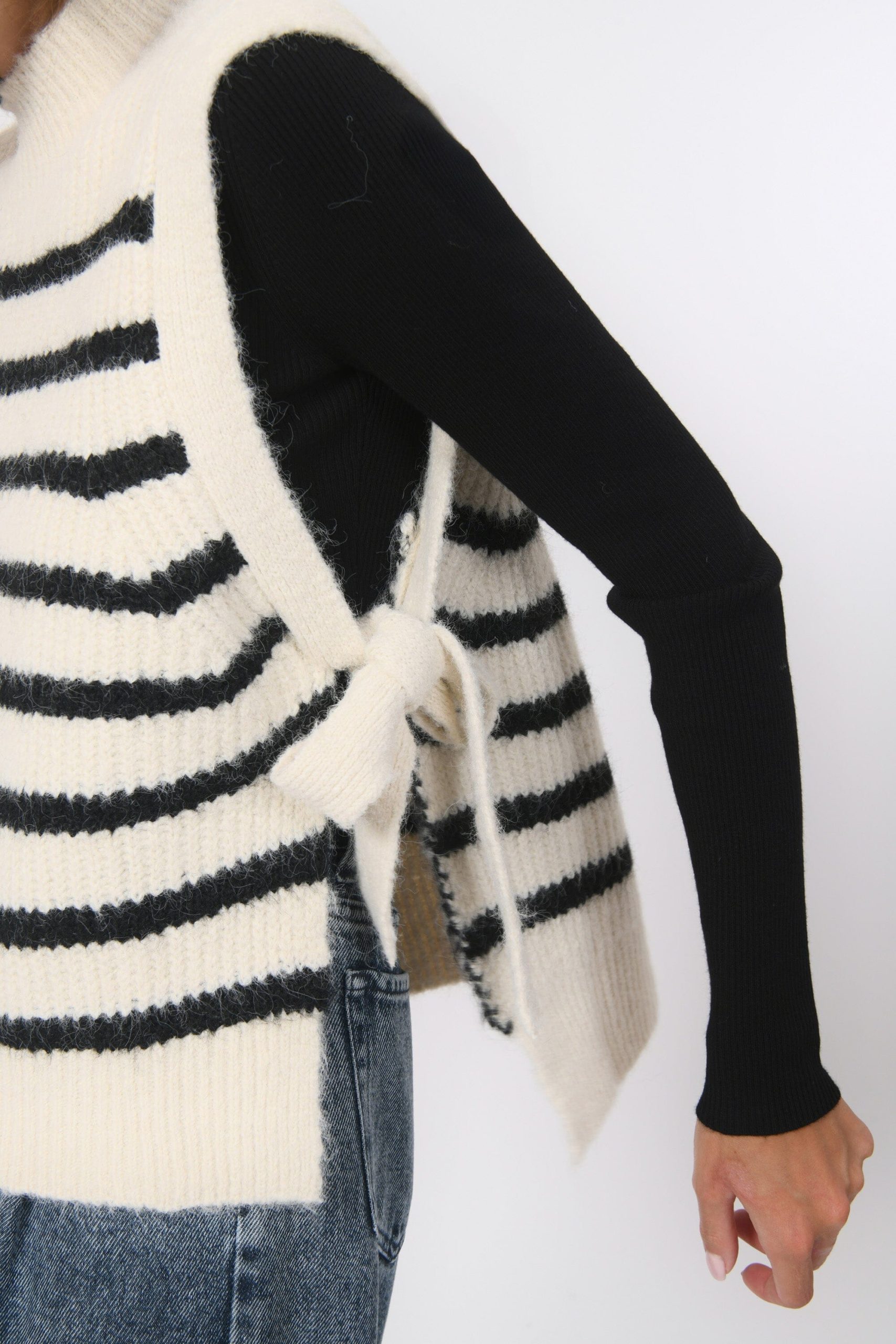 Basil, la marinière version sans manchesMaille contenant de la laine, tricotée en rayures contrastéesCol montantSans manches, liens à nouer sur les côtésDos légèrement plus longGrand bord côte sur le bas et le colLongueur 57cm en T0 Inès mesure 1m71 et porte une taille 0