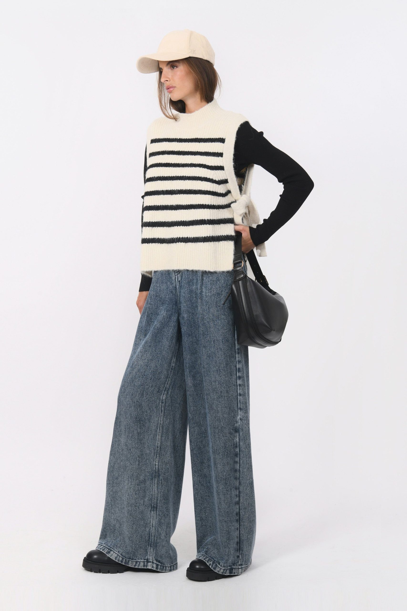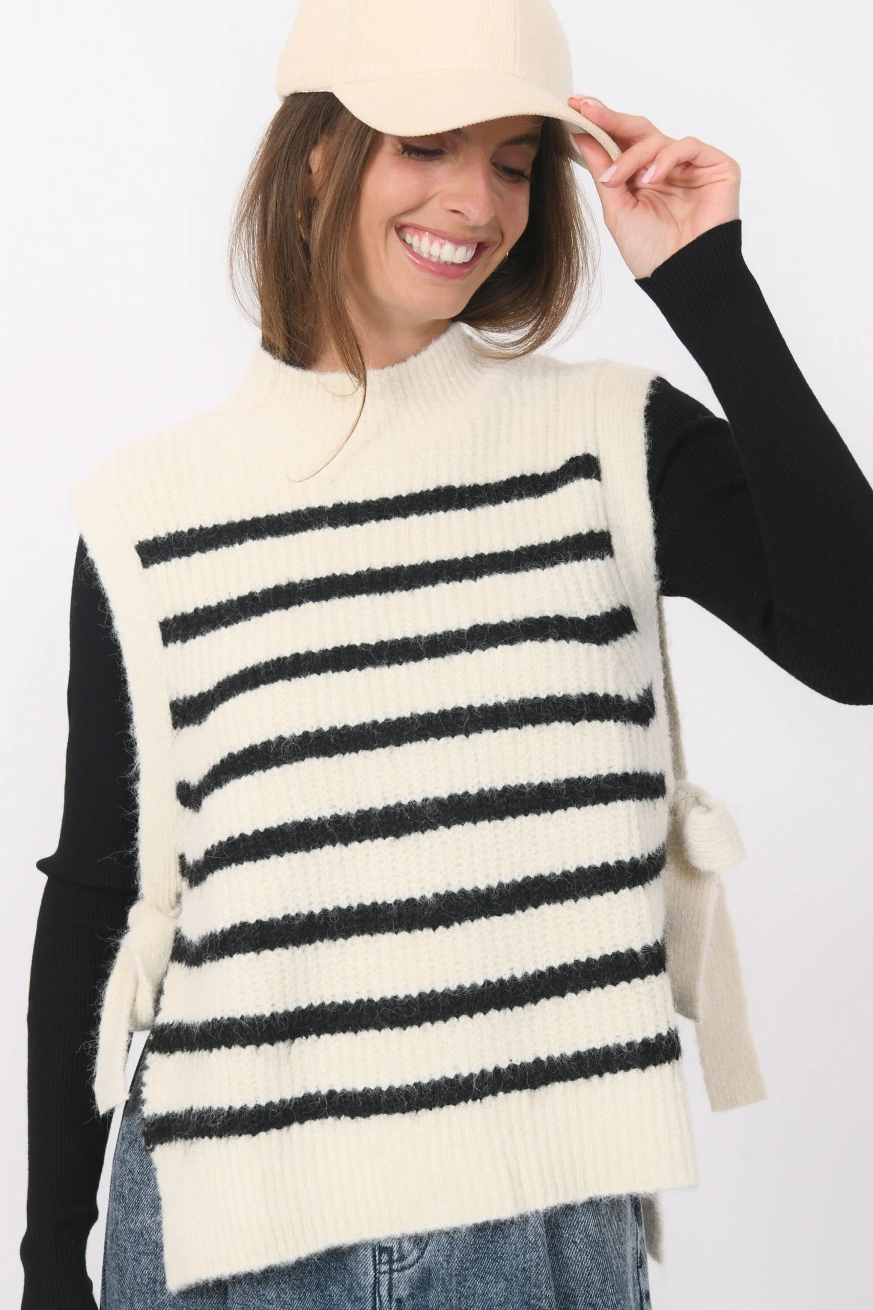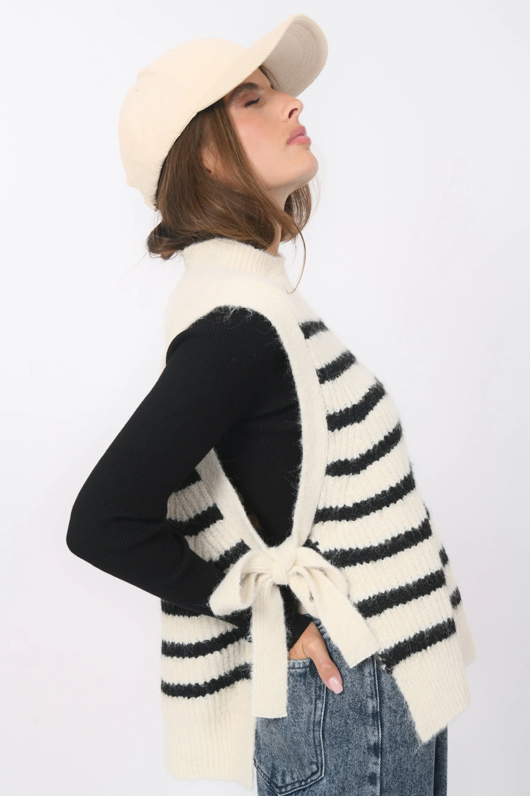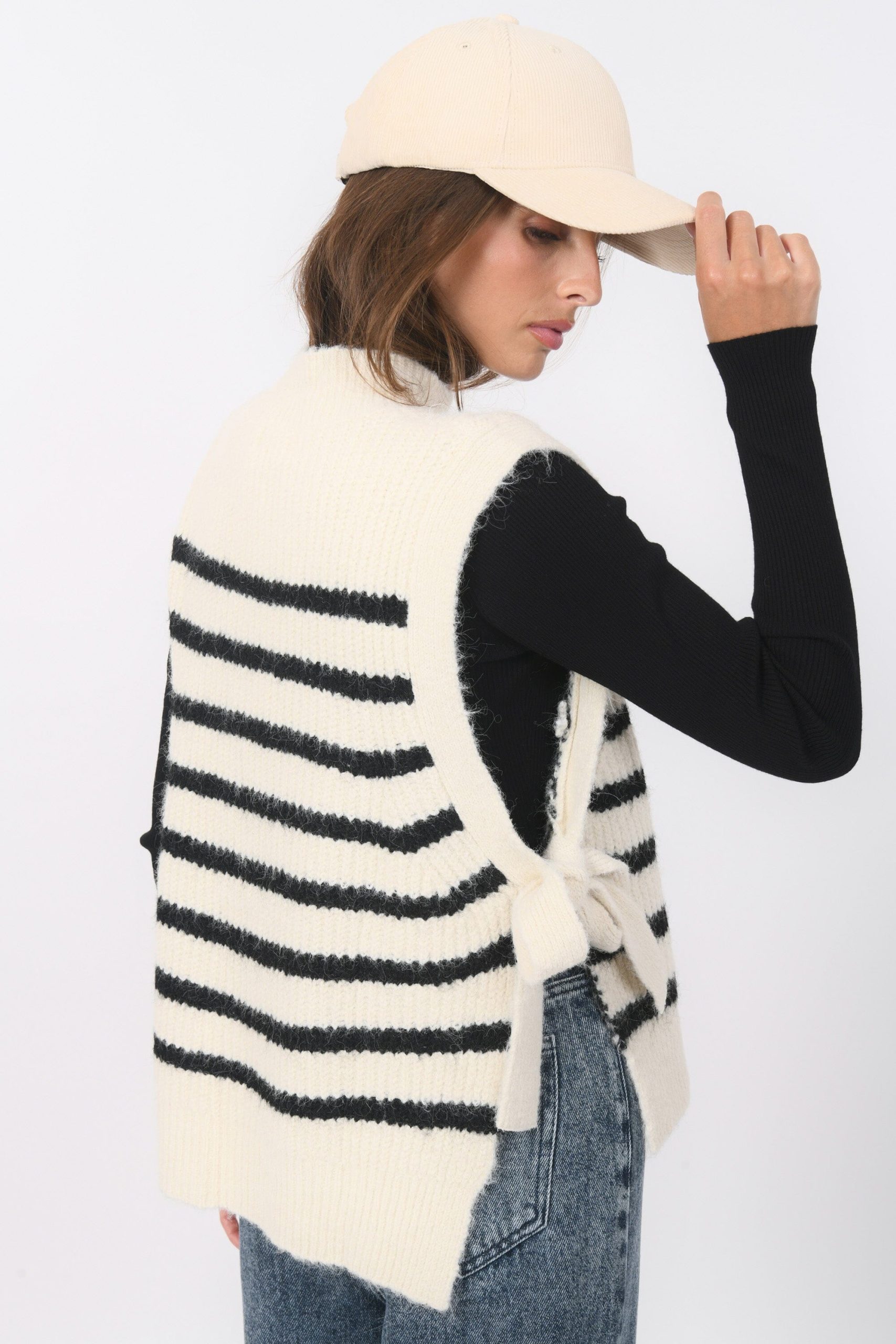 Basil, la marinière version sans manchesMaille contenant de la laine, tricotée en rayures contrastéesCol montantSans manches, liens à nouer sur les côtésDos légèrement plus longGrand bord côte sur le bas et le colLongueur 57cm en T0 Inès mesure 1m71 et porte une taille 0
