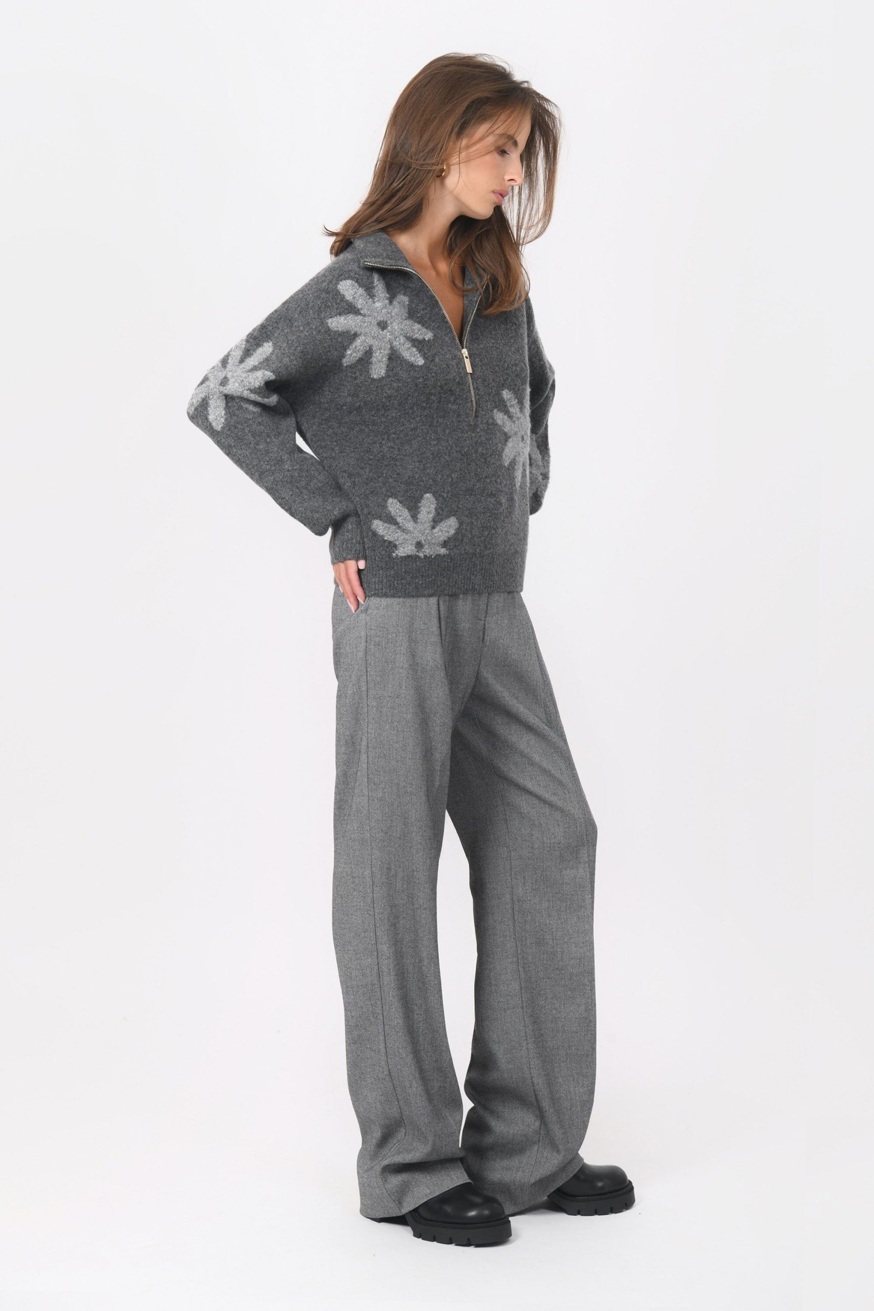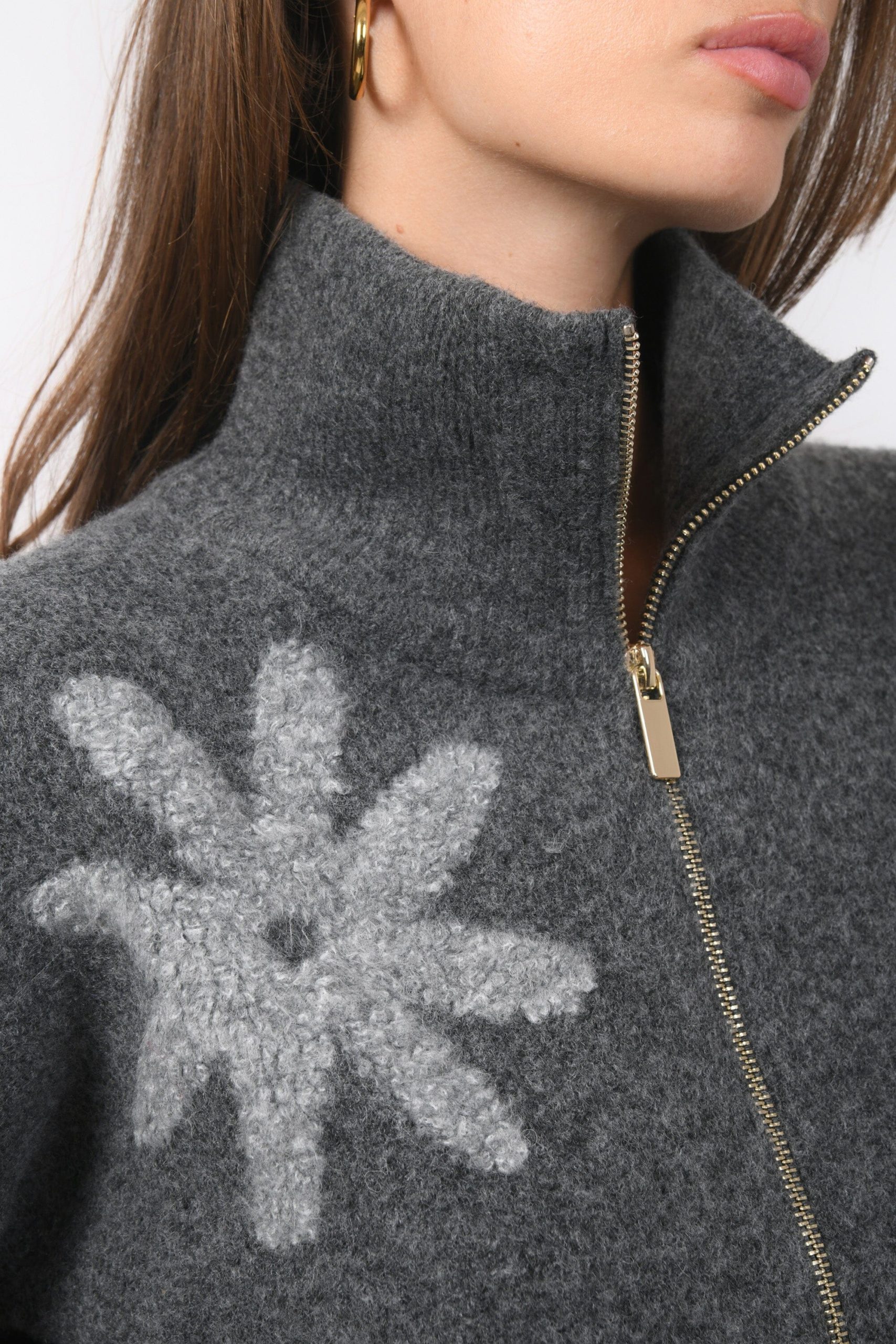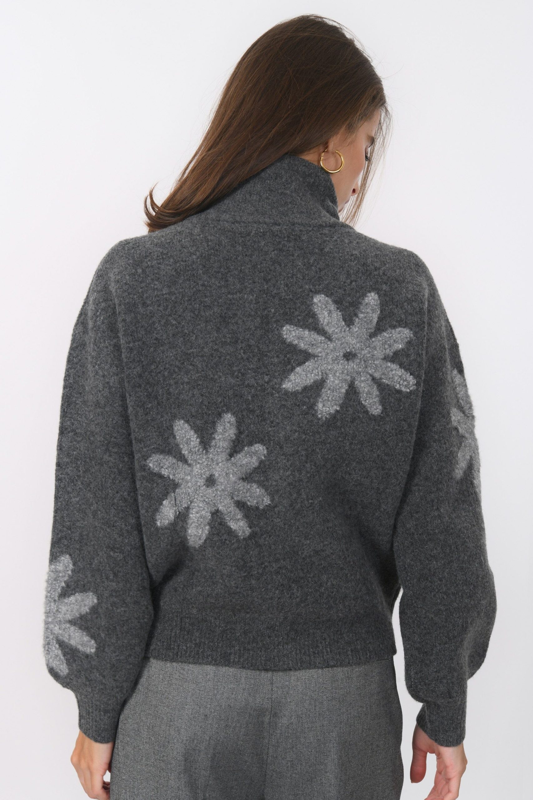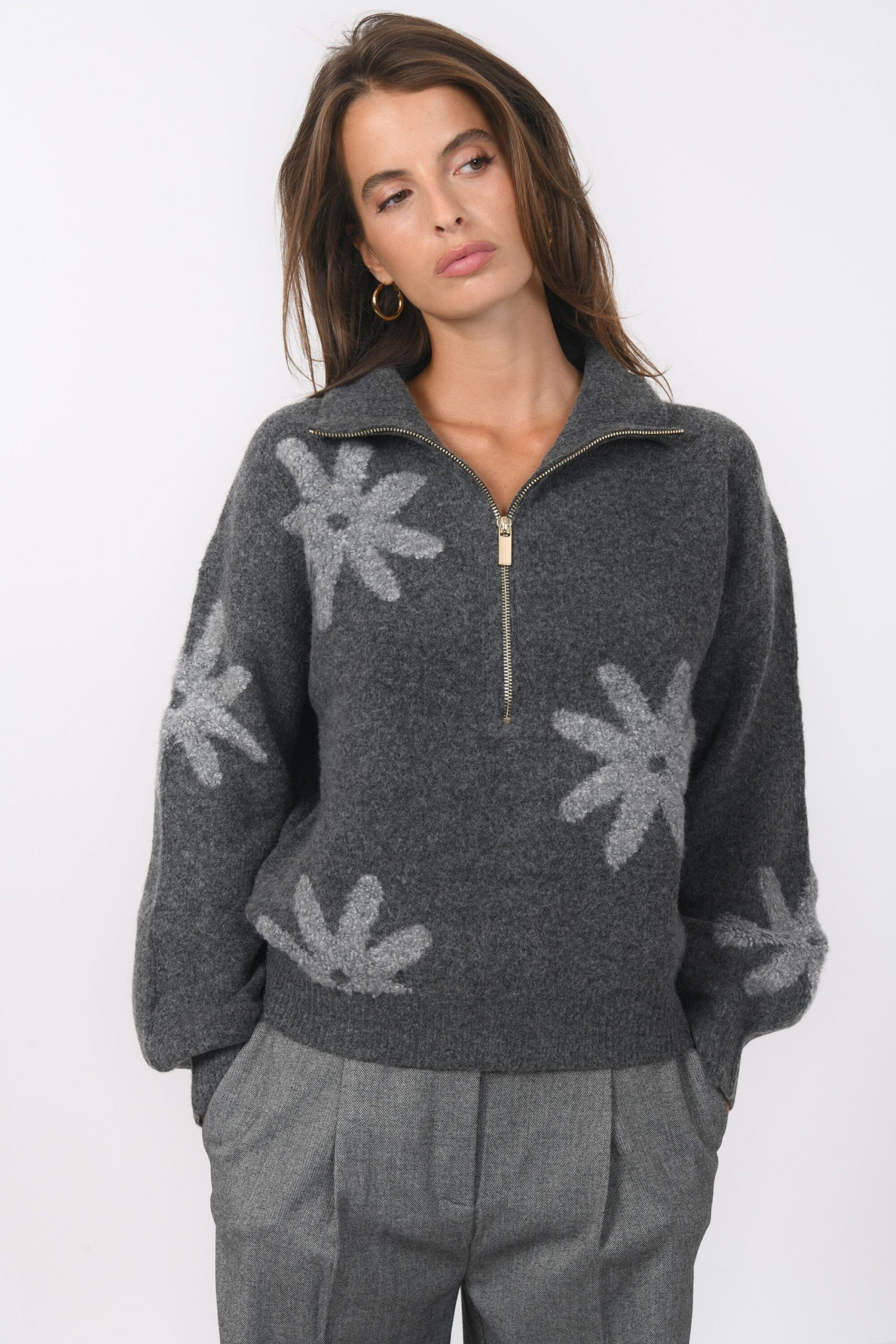 On ose les fleurs en hiver avec le pull BeatrixMaille moelleuse contenant de la laineJoli détail des fleurs en coloris contrastéCol camionneur montant avec zip centralEmmanchures descenduesManches longues amples, poignet resserréLongueur 60cm en T0 Inès mesure 1m71 et porte une taille 0