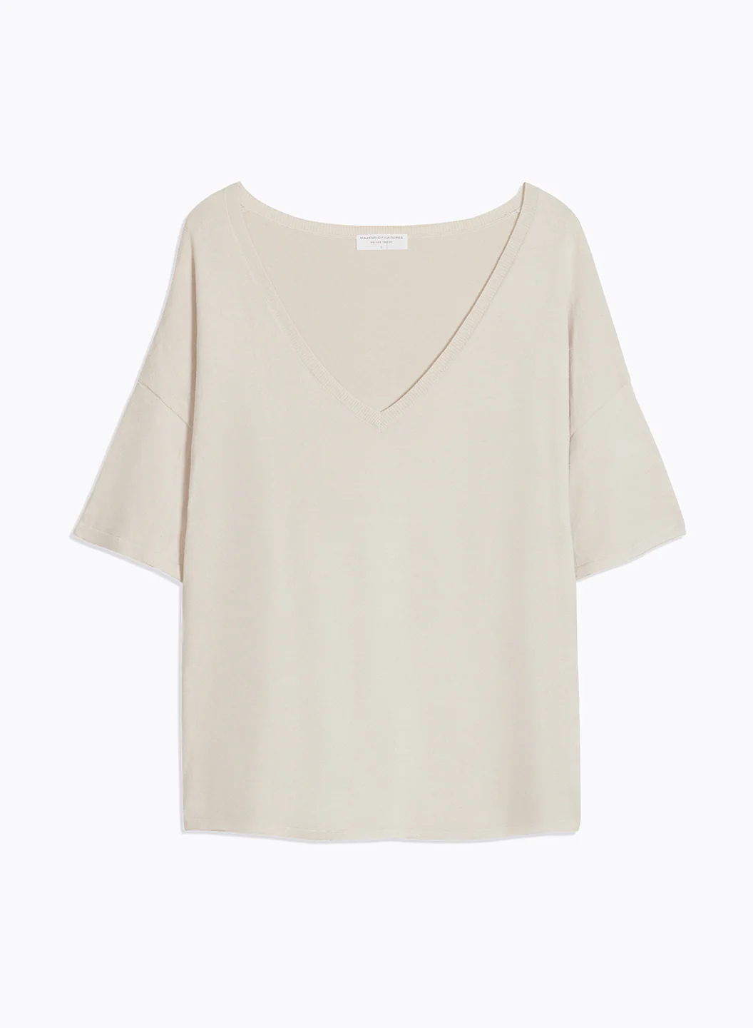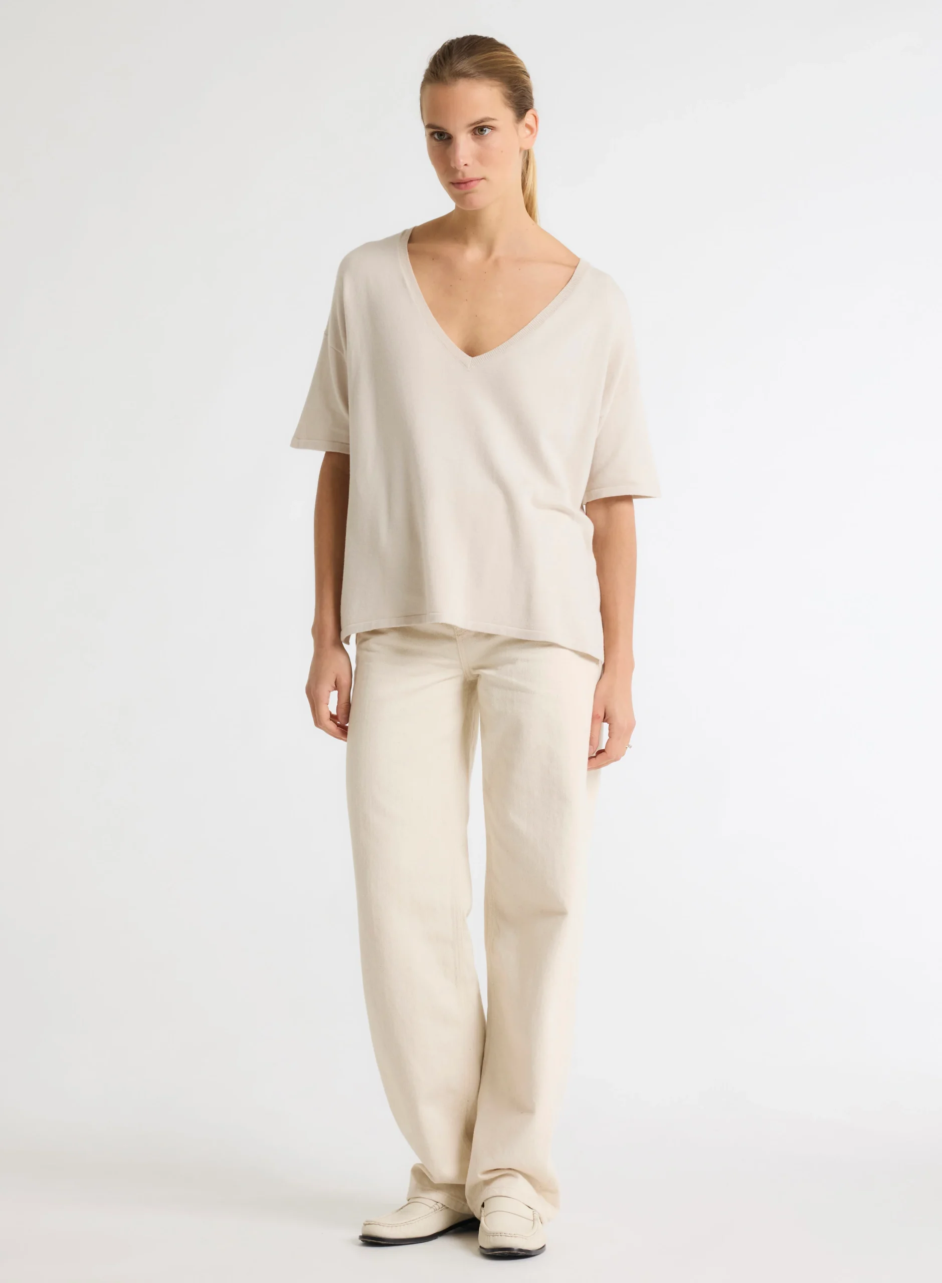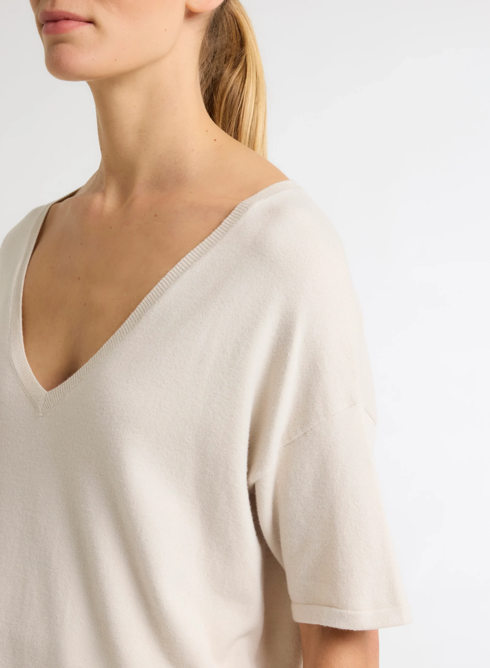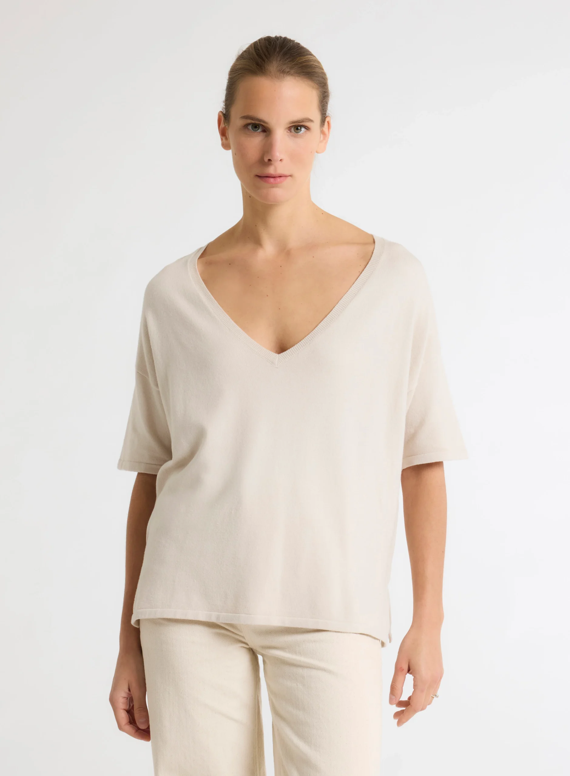 Pull Beige Col V Manches Courtes en Coton organique / Elasthanne