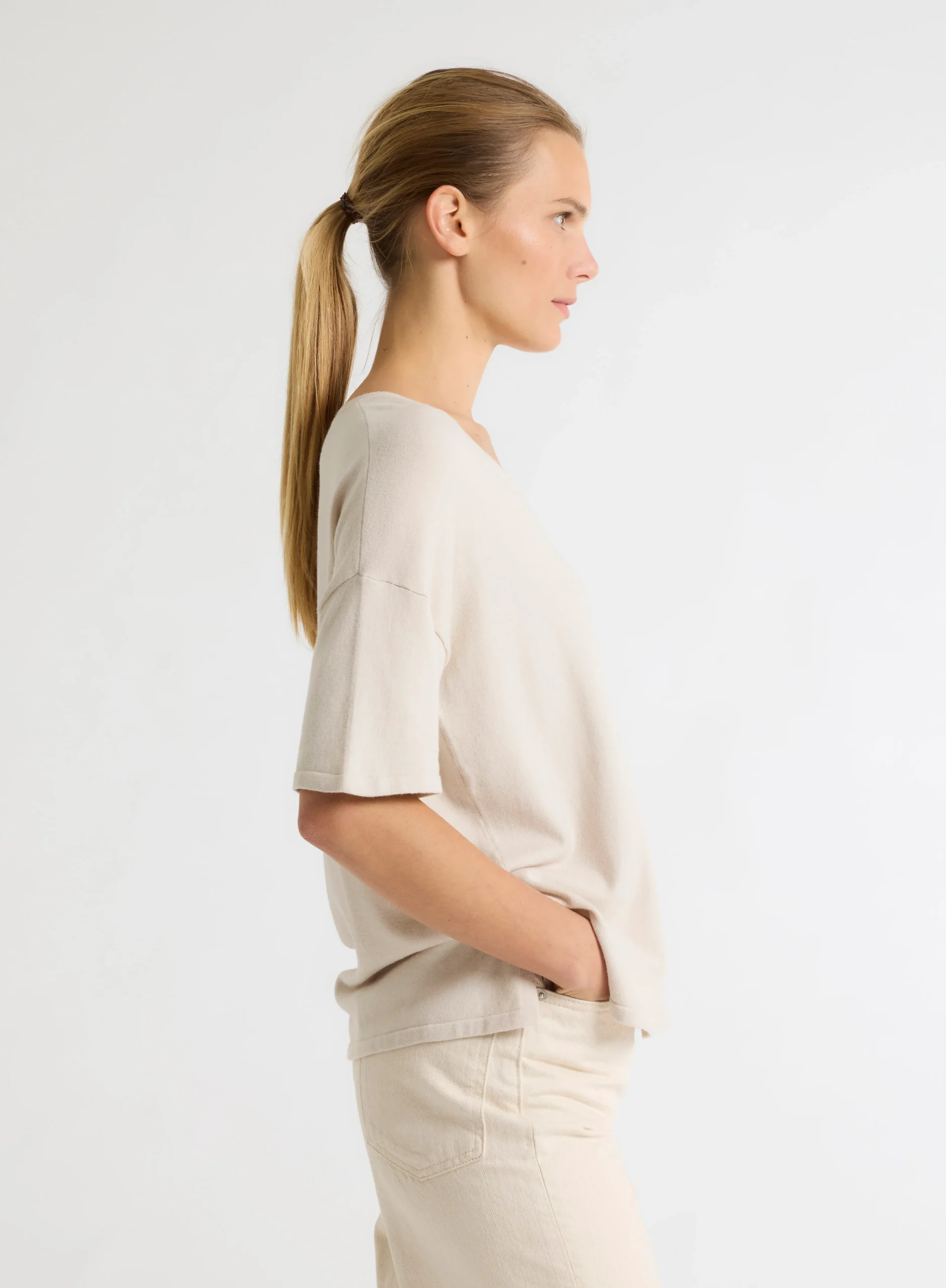 Ce pull beige à col V et manches courtes est confectionné avec un mélange de coton organique et d’élasthanne, offrant à la fois douceur, confort et une légère extensibilité. Parfait pour les journées plus fraîches, il vous assure une grande liberté de mouvement tout en restant élégant. Son design simple et son coloris neutre en font une pièce polyvalente qui se marie facilement avec divers looks.