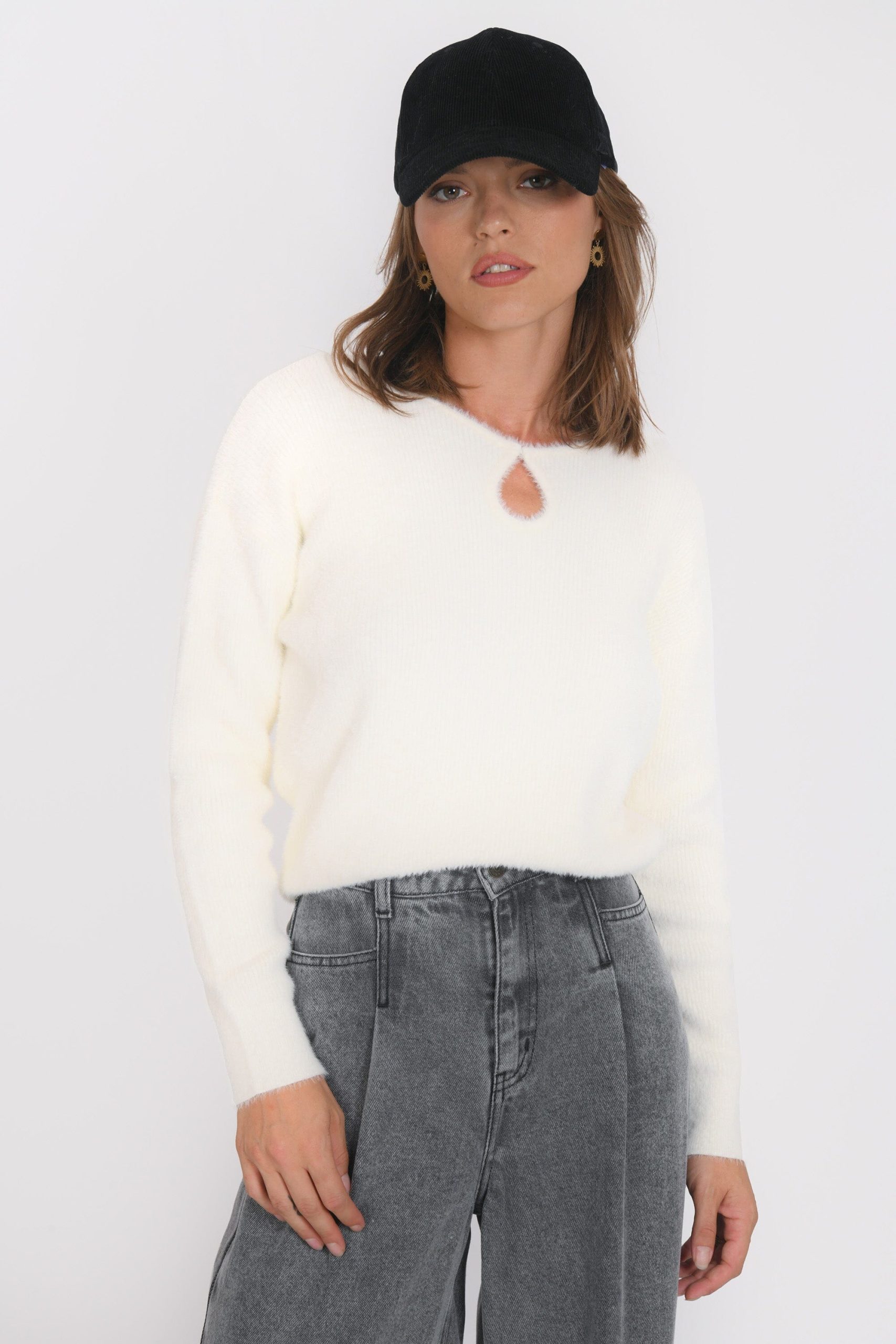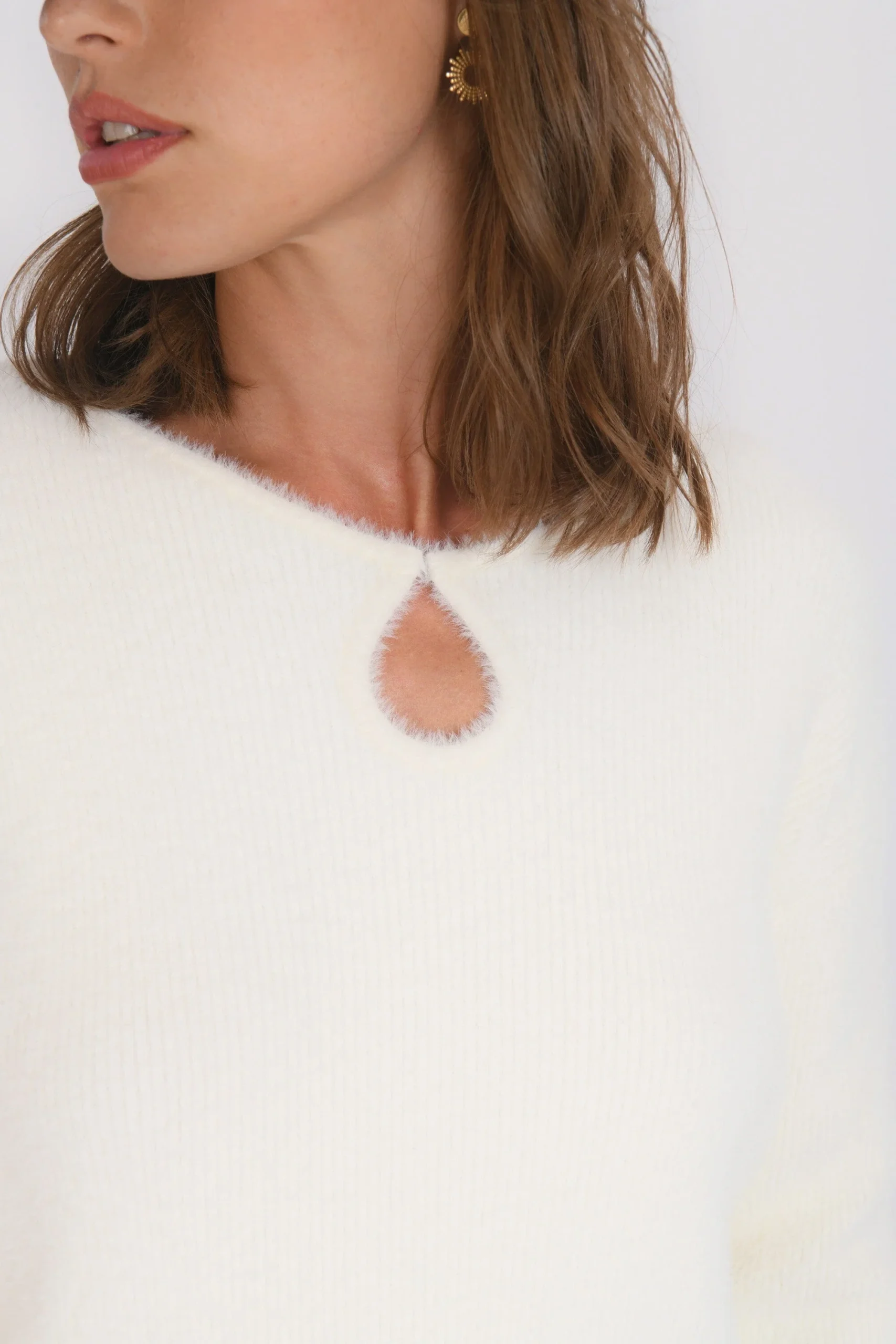 Belen, le pull doudou avec un beau détailMaille moelleuse effet fluffyOn adore le détail de l’ouverture goutte fermée par une agrafe invisibleEmmanchures descenduesManches longuesLongueur 55cm en T0 Sasha mesure 1m75 et porte une taille 0