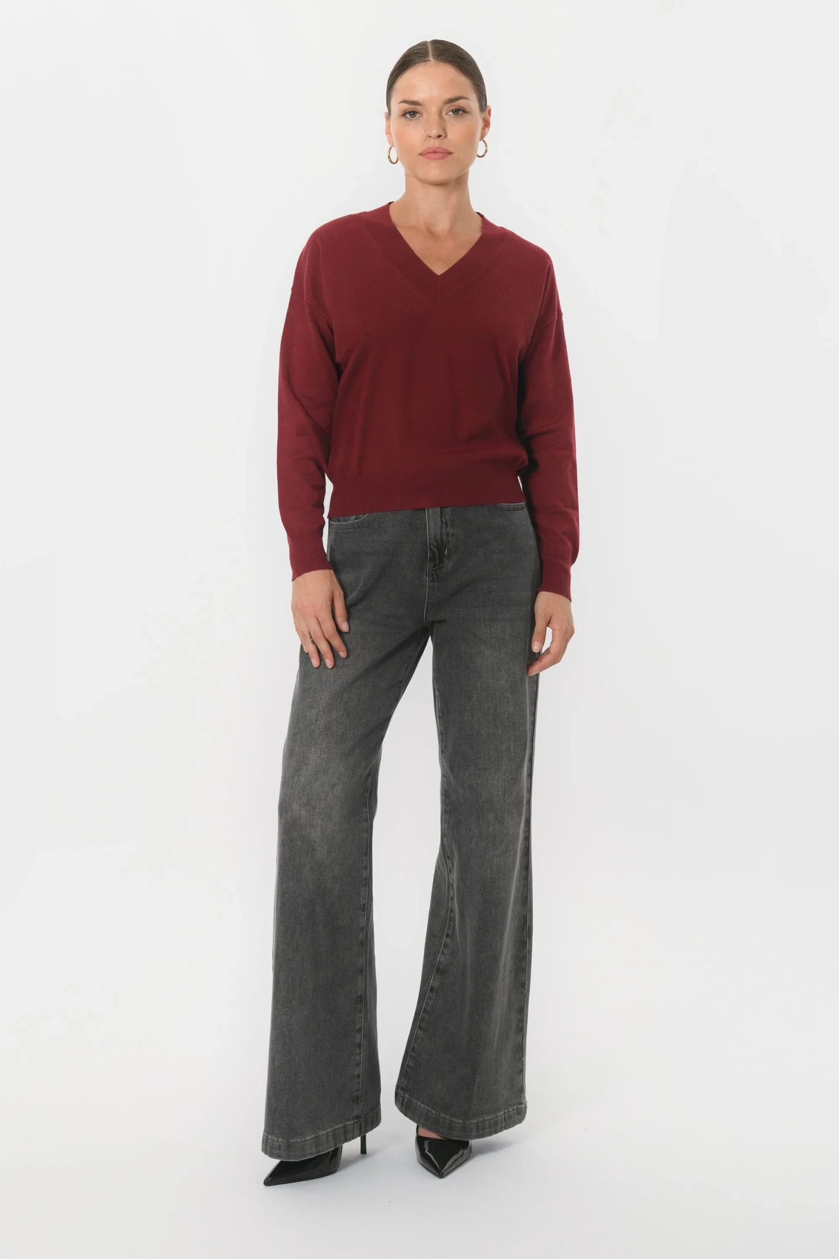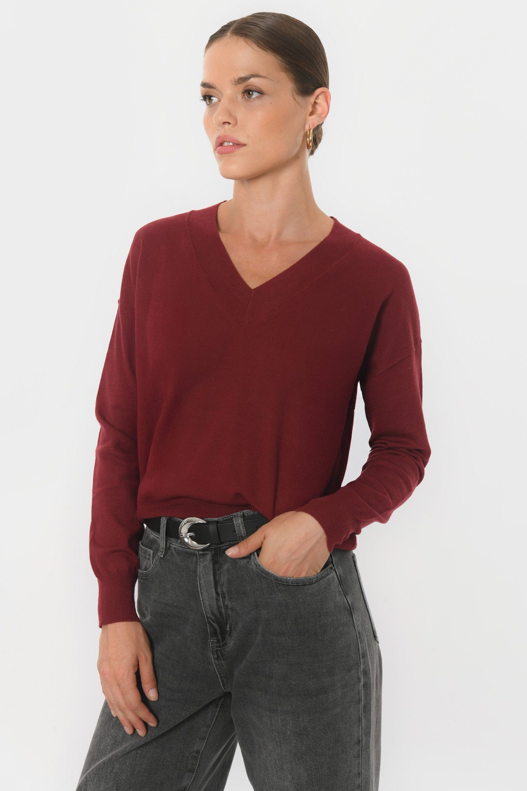 Belina, le petit pull au joli décolletéEn viscose mélangé, maille douce et extensibleEncolure VManches longues Coupe près du corpsLongueur 48cm en T0 Sasha mesure 1m75 et porte une taille 0