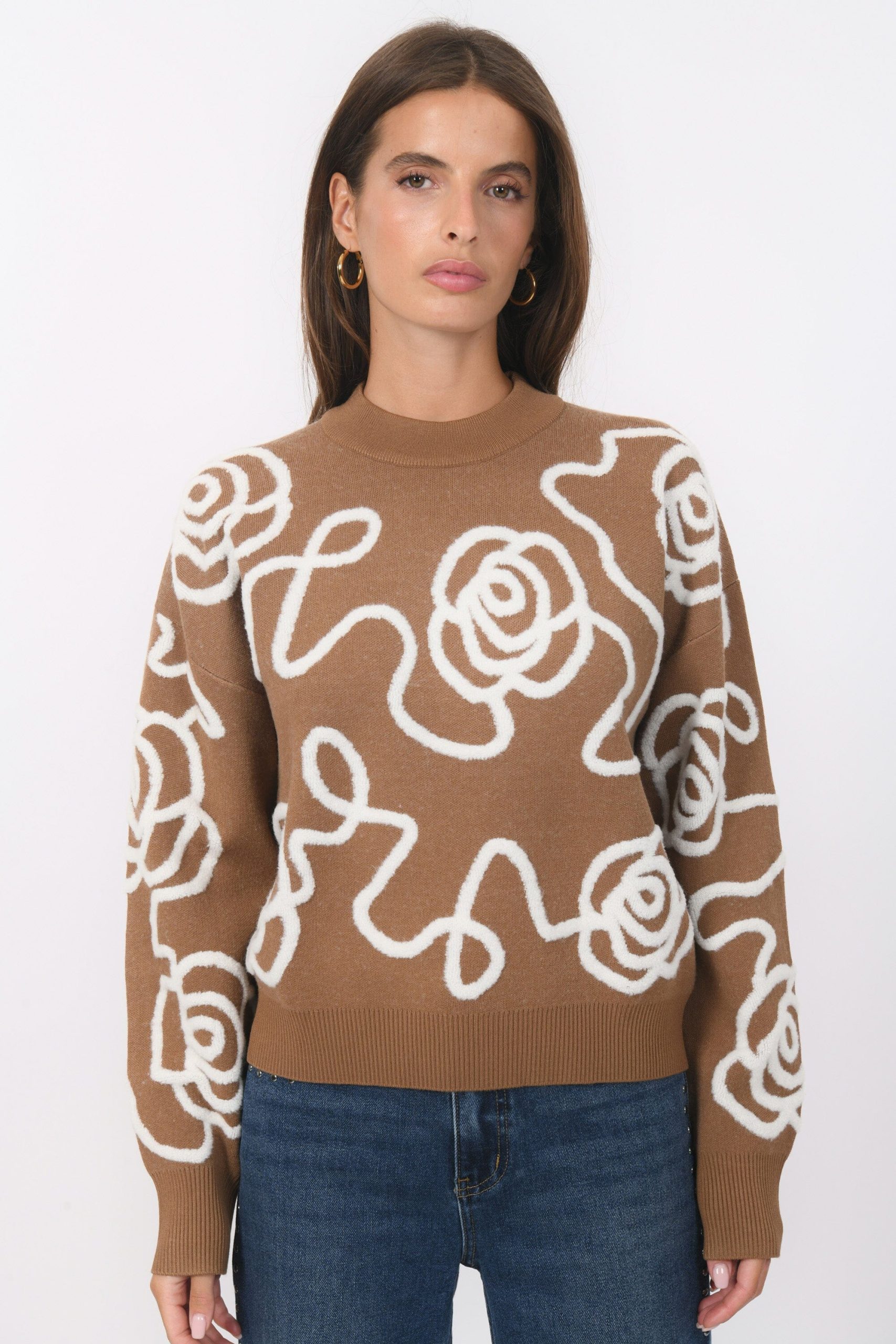 Maille fine et moelleuse avec fleurs travaillées en relief bi-matière