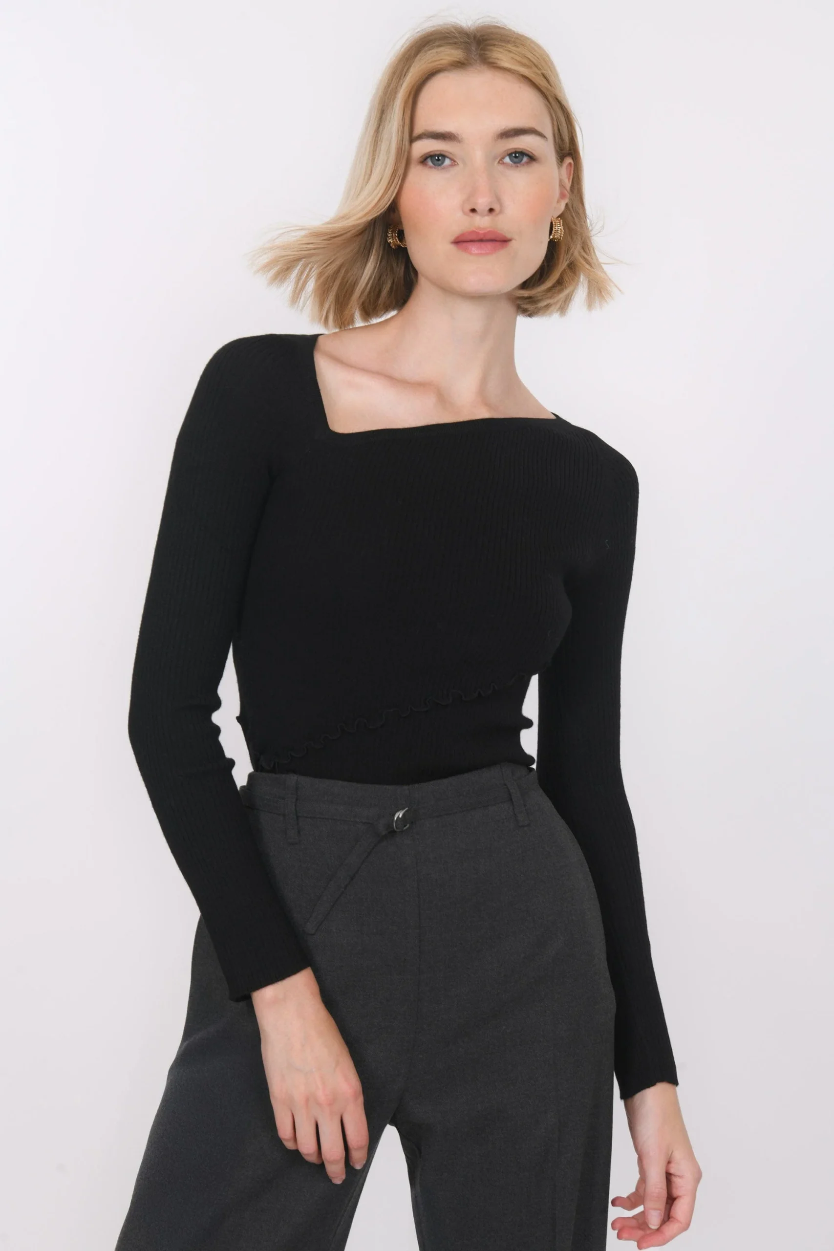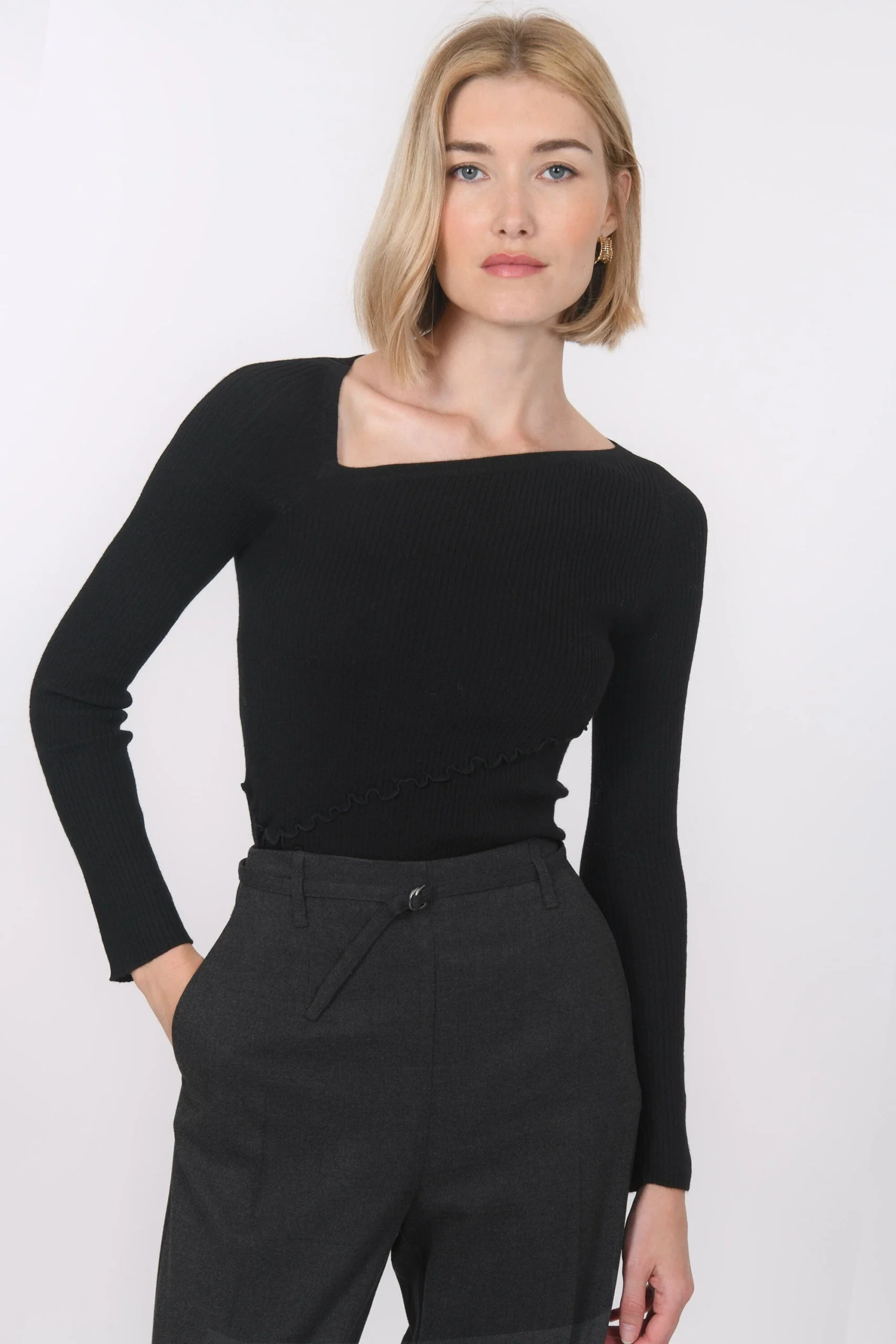 Look graphique et maille toute douce, voici le pull BitsuMaille contenant de la laine, très douce, travaillée en fines côtesCol asymétriqueTricotage fantaisie effet volants structurant la silhouetteCoupe ajustéeLongueur 53cm en T0 Océane mesure 1m77 et porte une taille 0