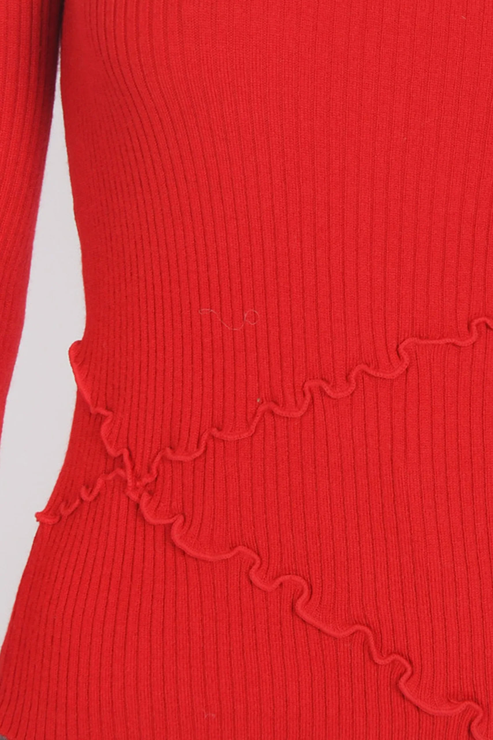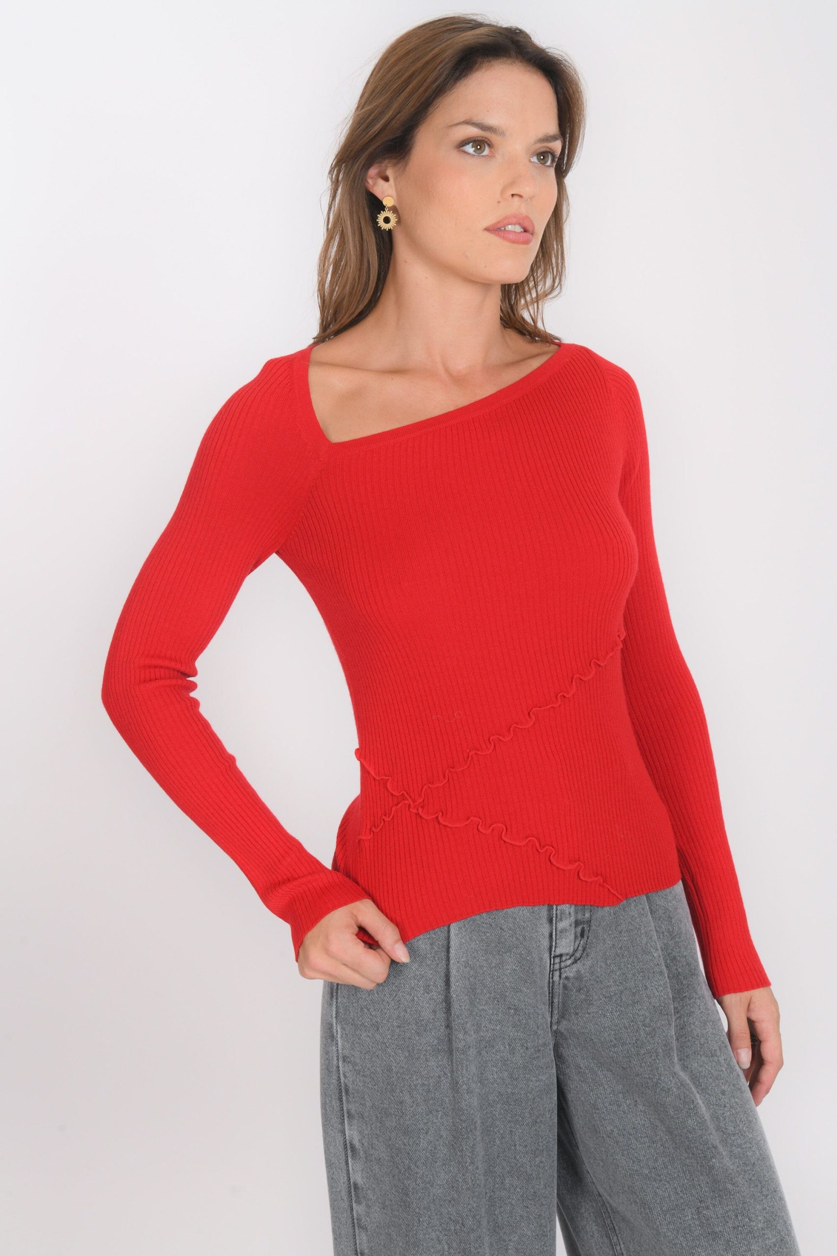 Look graphique et maille toute douce, voici le pull BitsuMaille contenant de la laine, très douce, travaillée en fines côtesCol asymétriqueTricotage fantaisie effet volants structurant la silhouetteCoupe ajustéeLongueur 53cm en T0 Sasha mesure 1m75 et porte une taille 0