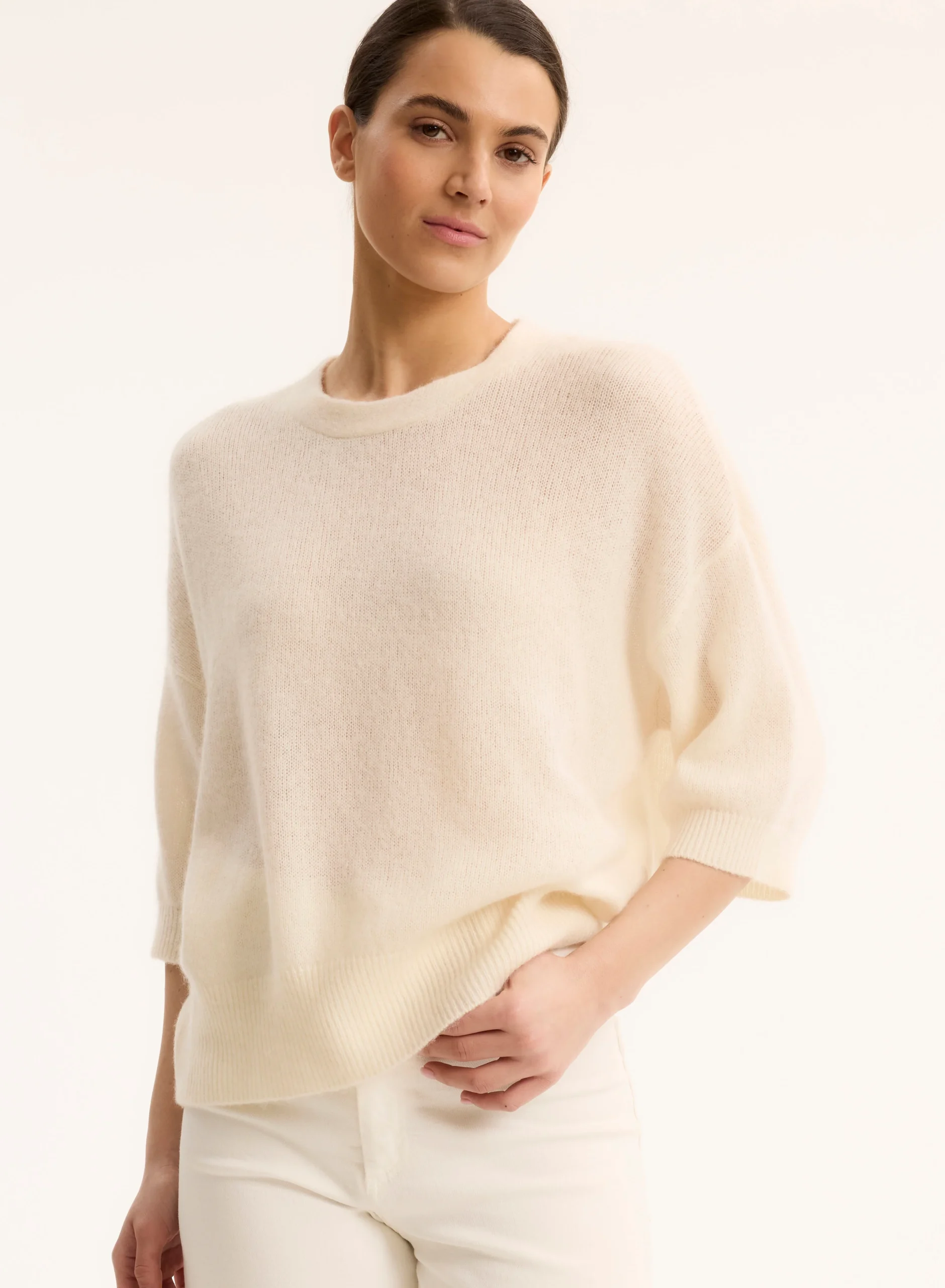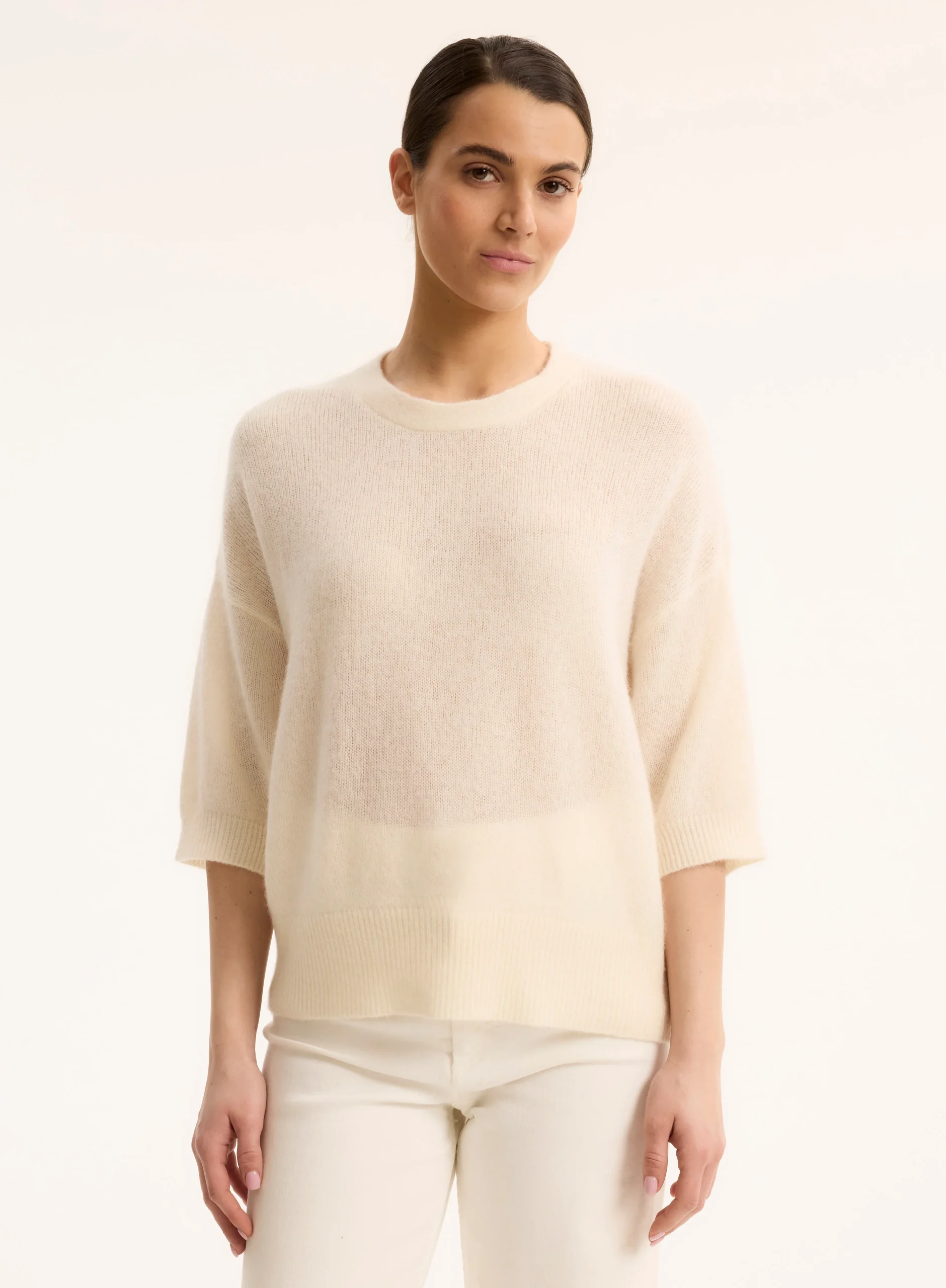 Pull Blanc Col Rond Manches Coudes en Laine / Soie / Cachemire