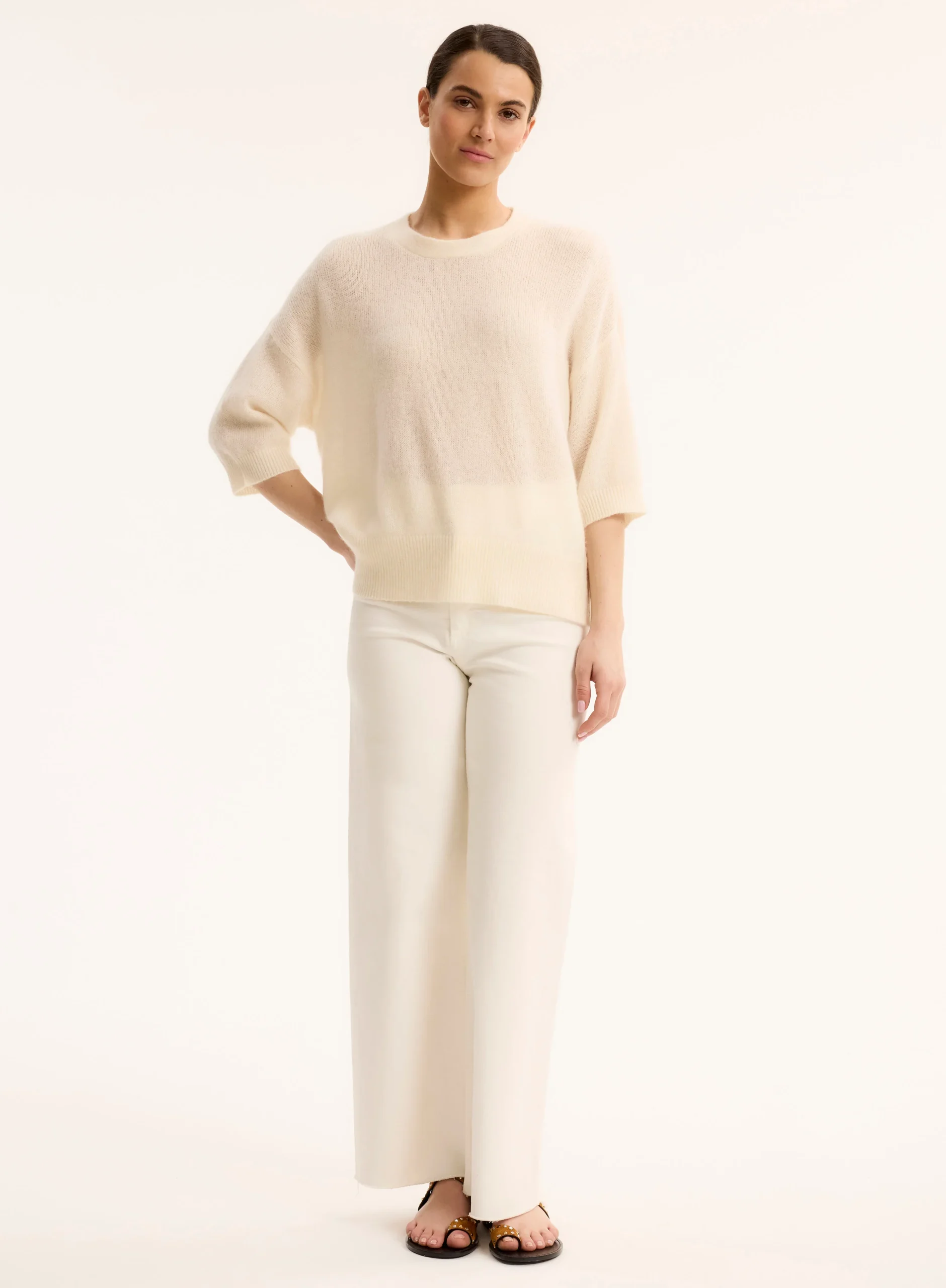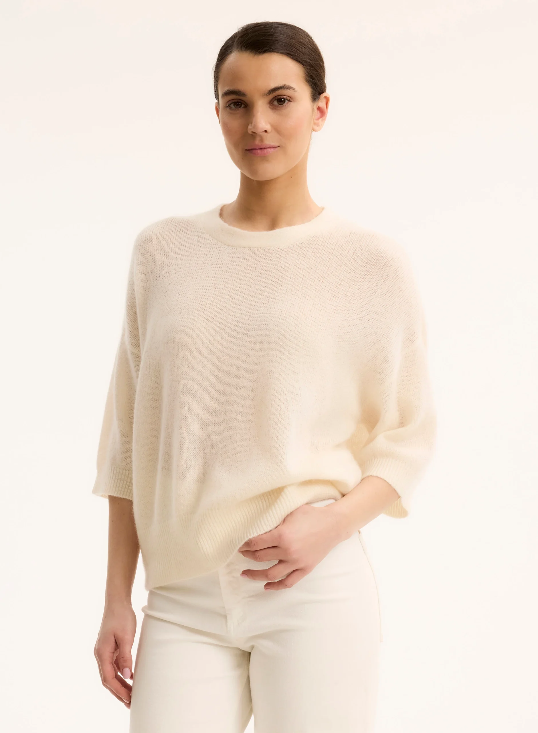 Ce pull blanc à col rond et manches aux coudes est un incontournable de la saison. Confectionné dans un tissu doux et confortable, il allie simplicité et élégance. Sa coupe intemporelle et ses manches légèrement raccourcies ajoutent une touche moderne à ce classique, tandis que sa couleur blanche facile à associer permet de le porter avec de nombreuses tenues. Parfait pour les journées fraîches, ce pull s’adapte aussi bien à un look décontracté qu’à un style plus sophistiqué.