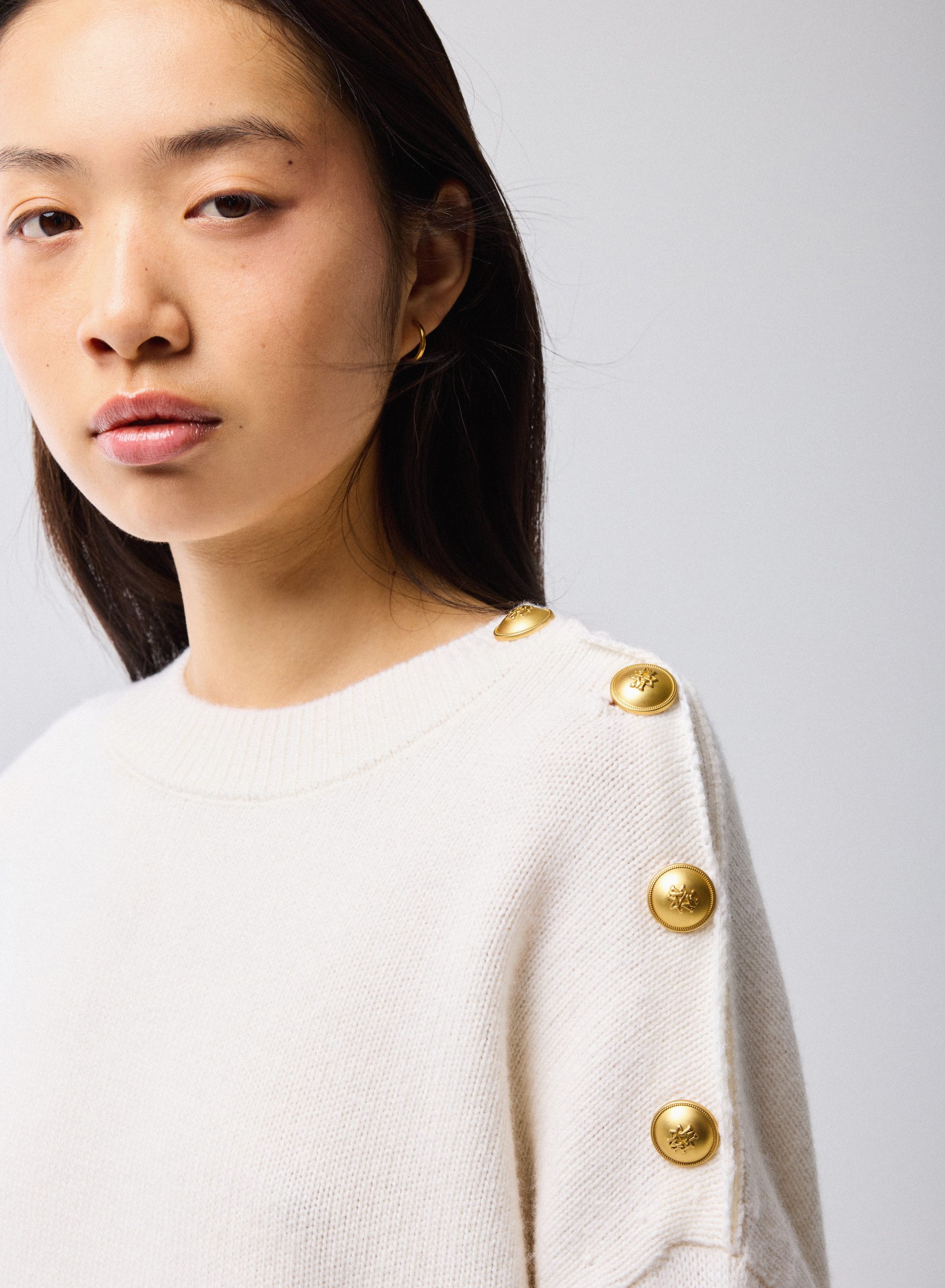 Pull Blanc Col Rond Manches Longues en Laine / Cachemire, sublimé par un bouton doré brossé sur le côté. Tricoté dans une maille douce et chaude, ce modèle allie confort naturel et touche d’élégance discrète pour un porté quotidien raffiné.