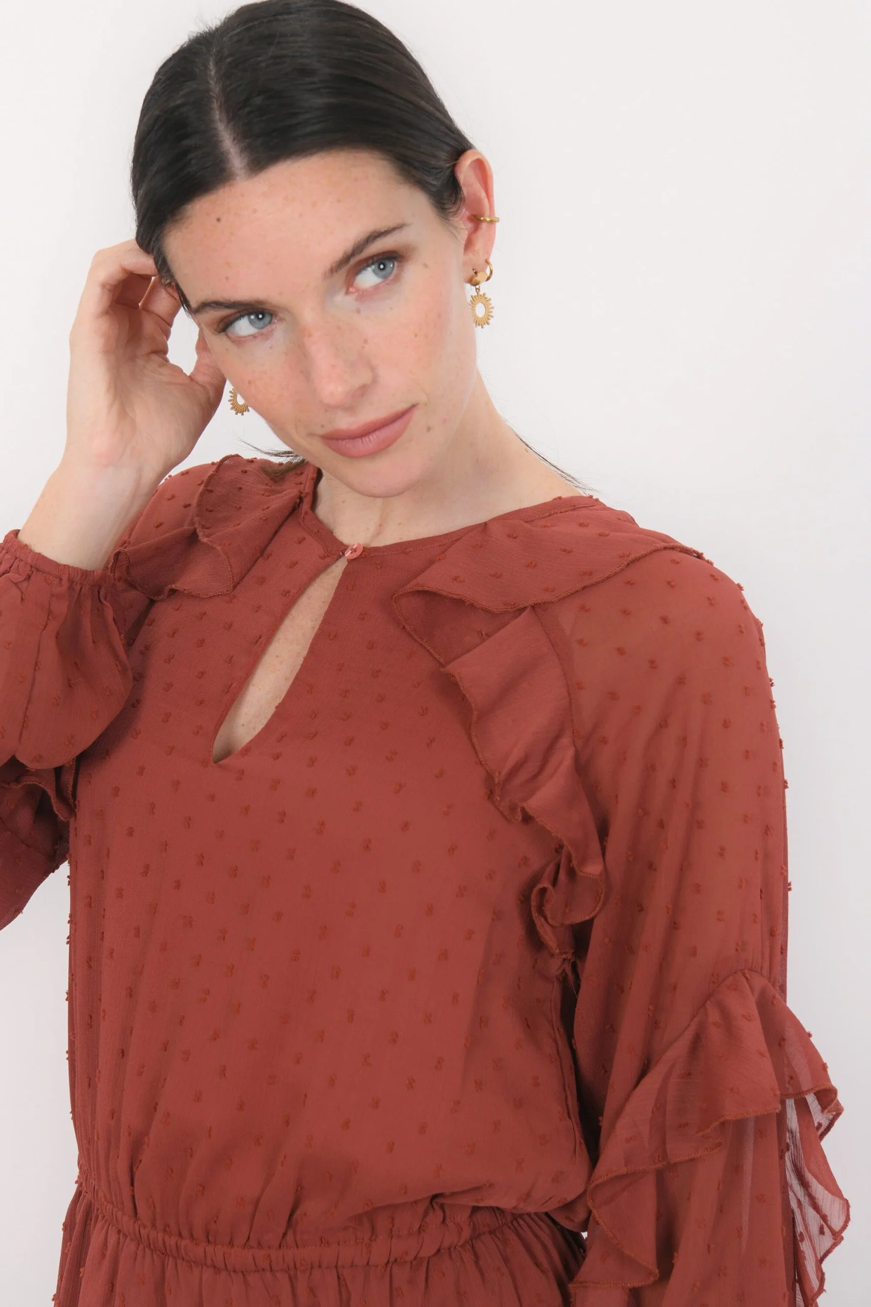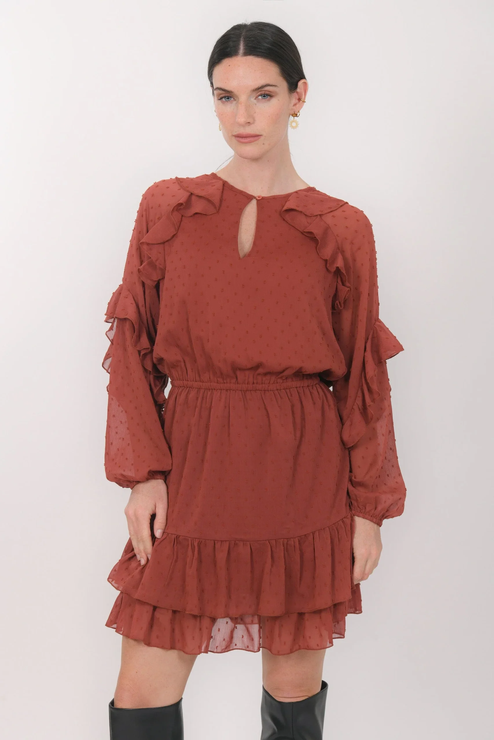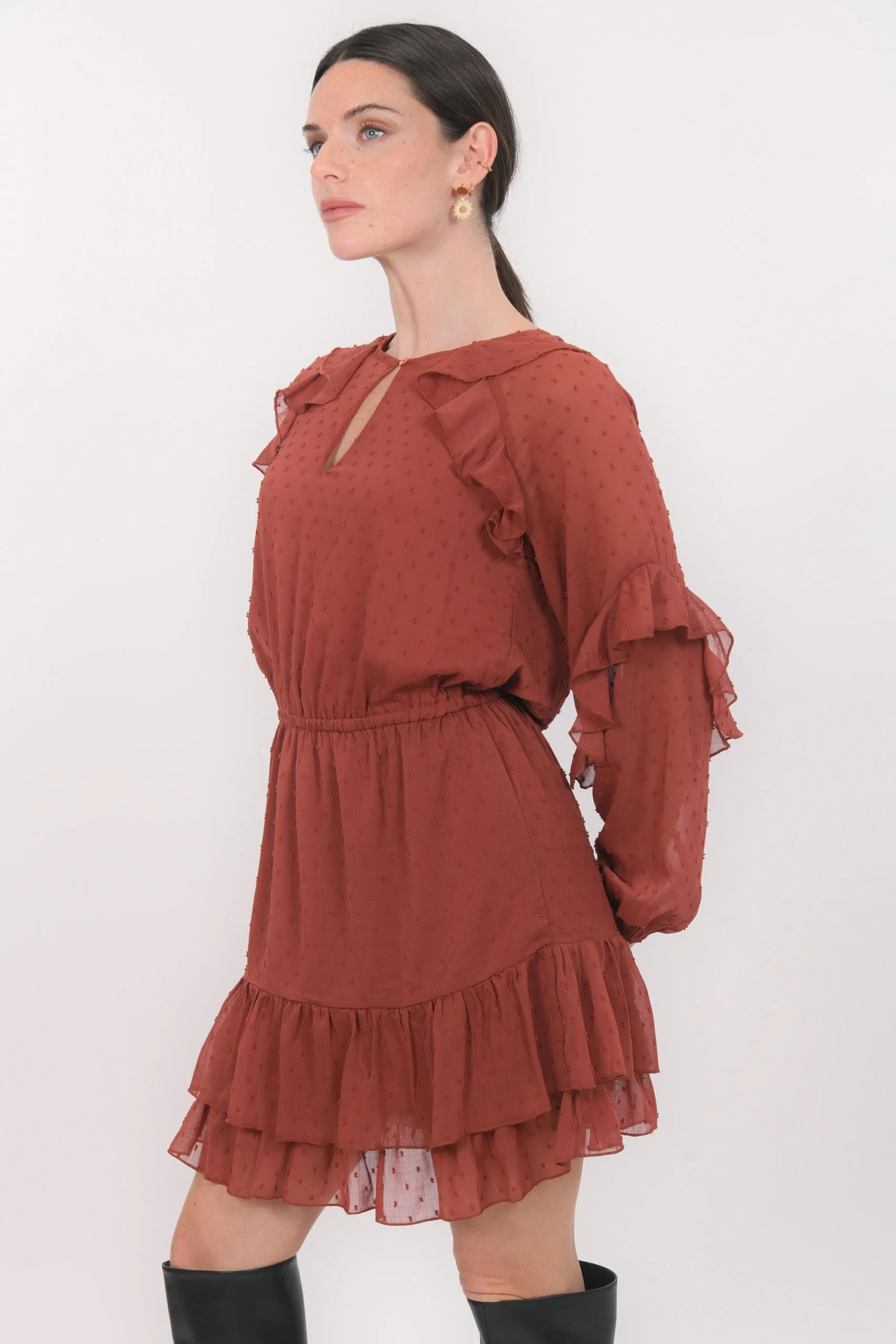 Britanny, la robe qui joue avec les volumesTissu façon voile, plumetis ton sur tonEncolure avec fente fermée par un boutonManches ballon avec volant et plis plats, poignet élastiquéTaille élastiquéeOn adore le détail du volant qui souligne l’encolure et les emmanchuresPartie jupe évasée avec volant sur le basEntièrement doubléeLongueur 93cm en T36