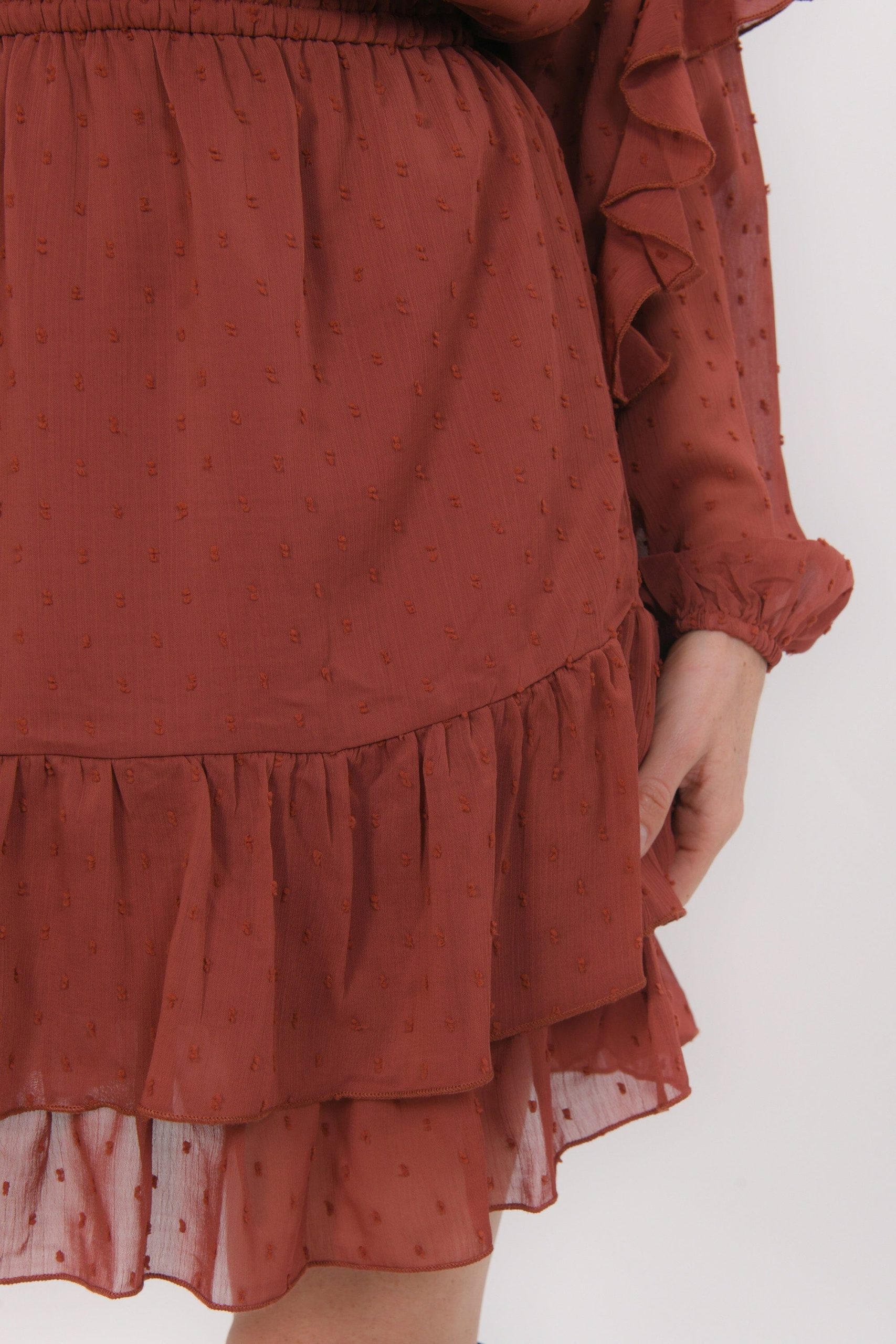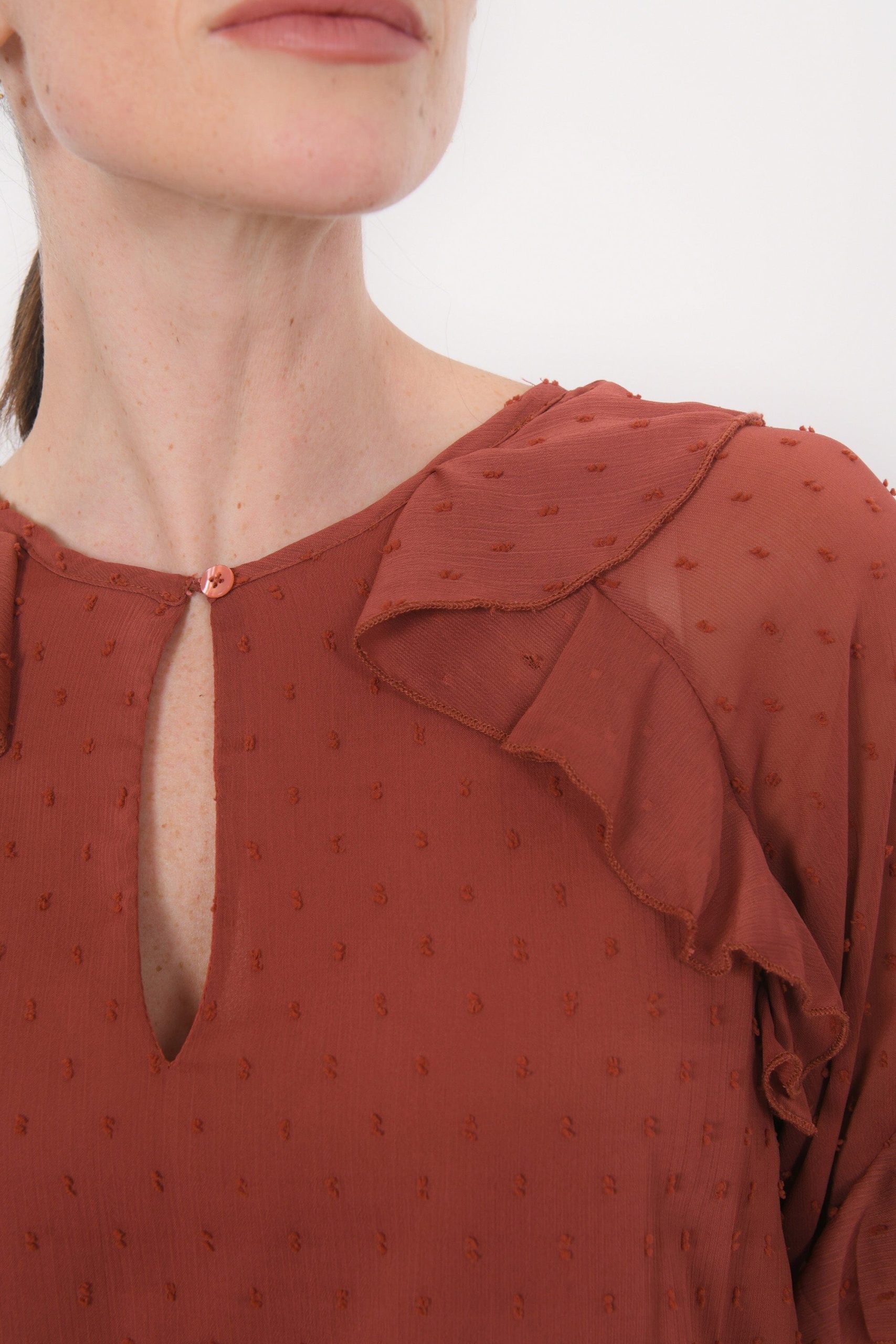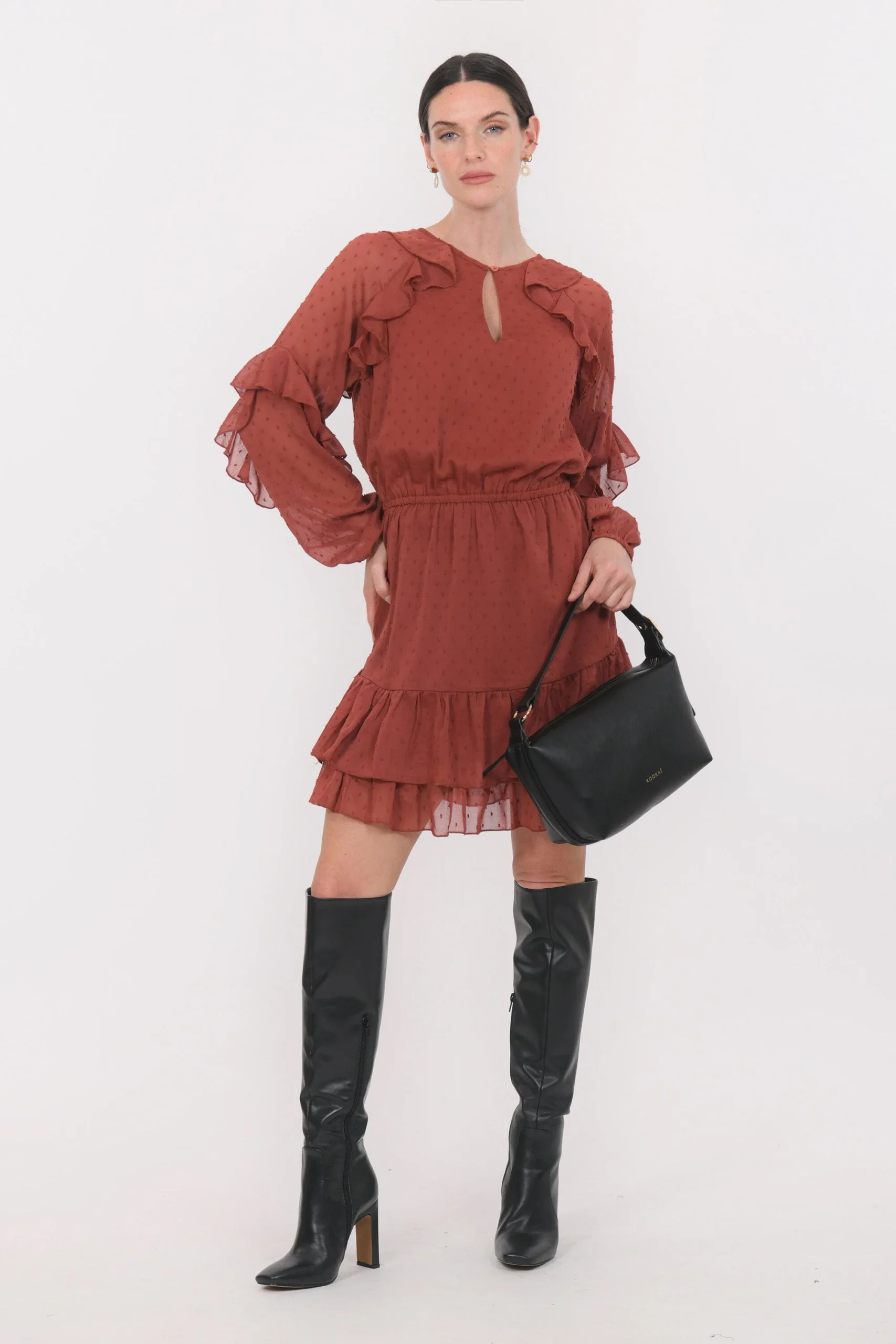 Britanny, la robe qui joue avec les volumesTissu façon voile, plumetis ton sur tonEncolure avec fente fermée par un boutonManches ballon avec volant et plis plats, poignet élastiquéTaille élastiquéeOn adore le détail du volant qui souligne l’encolure et les emmanchuresPartie jupe évasée avec volant sur le basEntièrement doubléeLongueur 93cm en T36