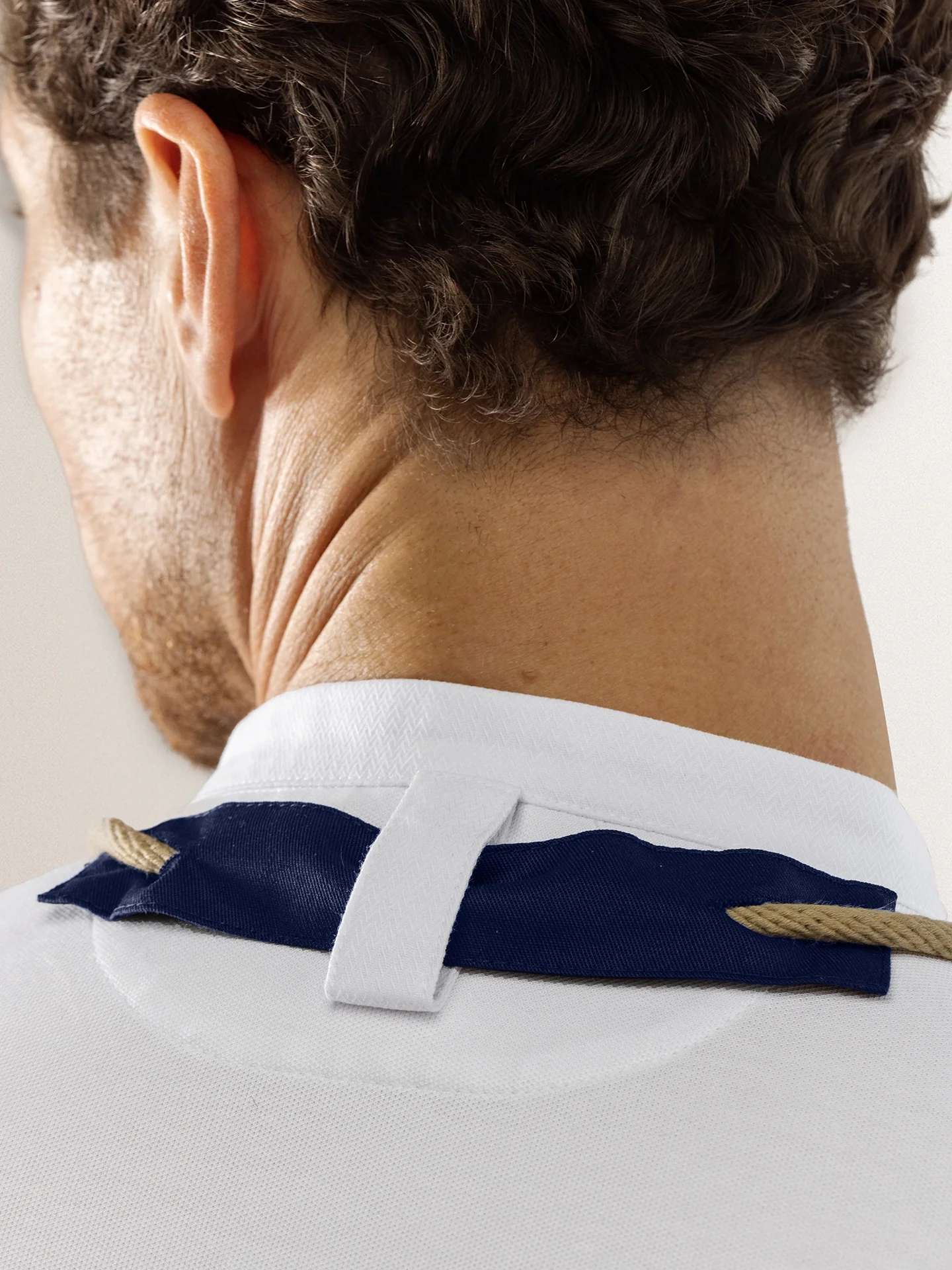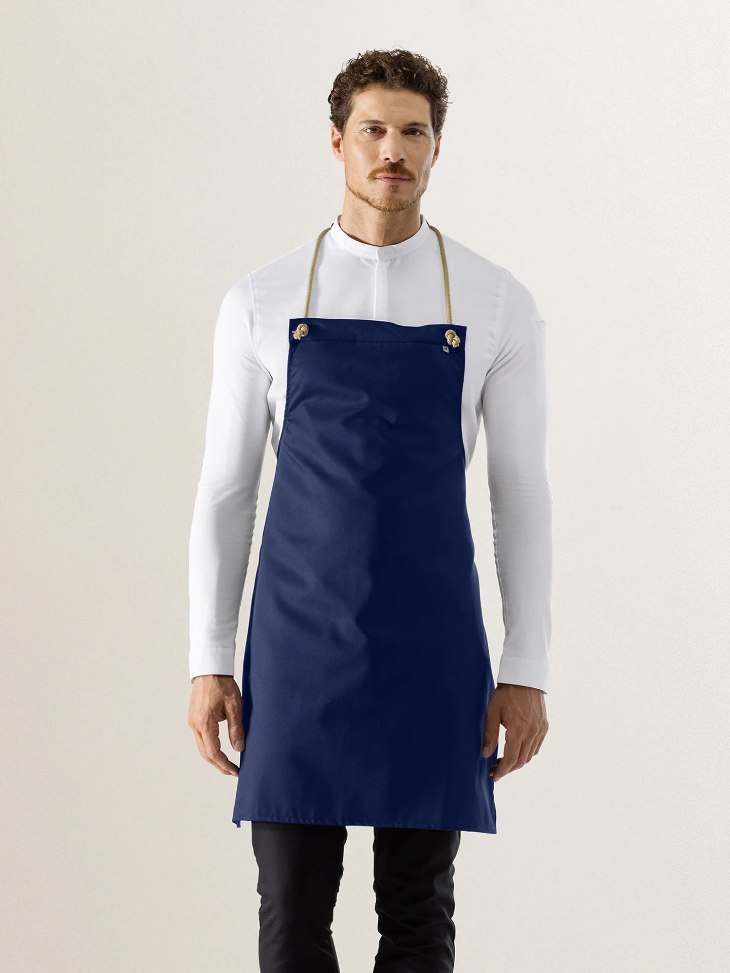 Inspired by the design of the original Spanish apron, this blue bib apron is finished with a soft cotton cord rope in the neck, which gives it a tough but playful look. By using luxurious Italian denim as a fabric, the chef or server will look stylish.