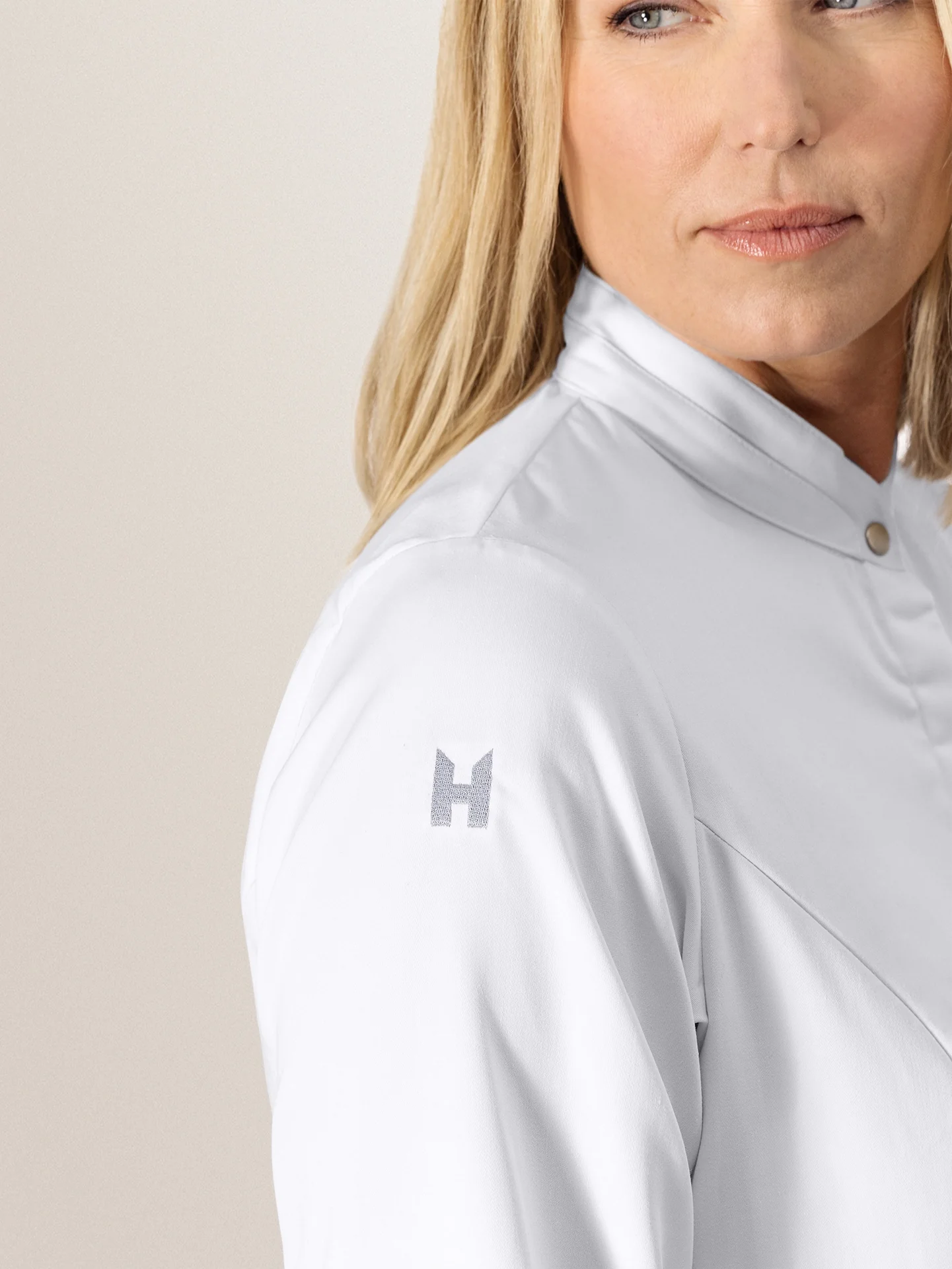 A classic slim-fit chef jacket for women, featuring a blind closure, slim sleeves and a split on both sides. By using a supple fabric with satin binding, this white chef jacket ensures optimal heat regulation and cooling while working in the kitchen.